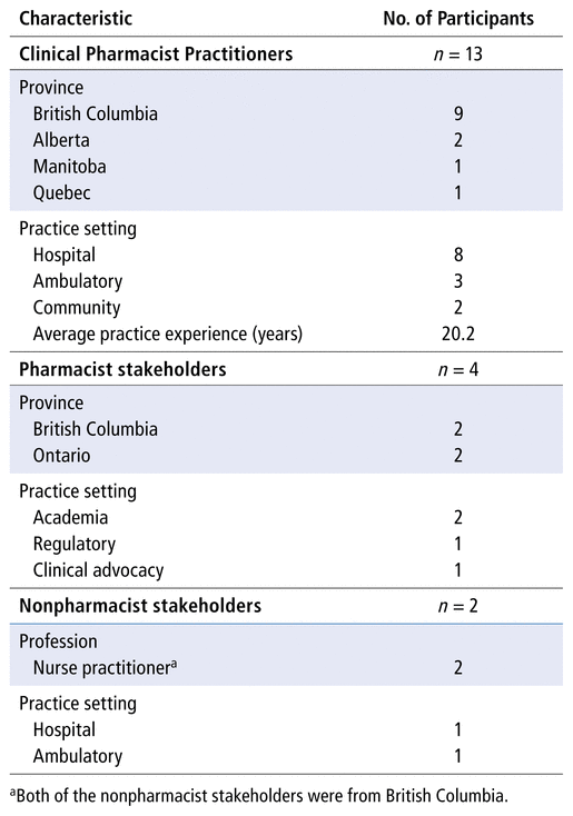 Study recruitment consisted of purposive and snowball sampling.8,9 The study team, which included pharmacy professionals meeting the definition of a CPP, nominated potential participants from their professional networks. In addition, 8 clinical pharmacy practice leaders from 6 Canadian provinces were engaged to nominate CPPs in their respective provinces. Finally, study participants were asked to suggest CPP colleagues for consideration.