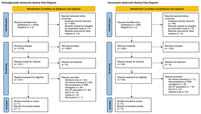 Studies comparing TDM strategies and clinical outcomes in pwCF who received an IV aminoglycoside or IV vancomycin were included. To be eligible for inclusion, the TDM strategies had to be described in enough detail to be reproducible. Nonhuman and in vitro studies, studies without full published reports, and those not available in English were excluded. Pairs of authors independently screened all studies identified in both the initial (J.J., N.G.) and subsequent (J.J., R.D.) searches. Discrepancies were resolved by consulting 2 additional authors (V.S., R.D.).