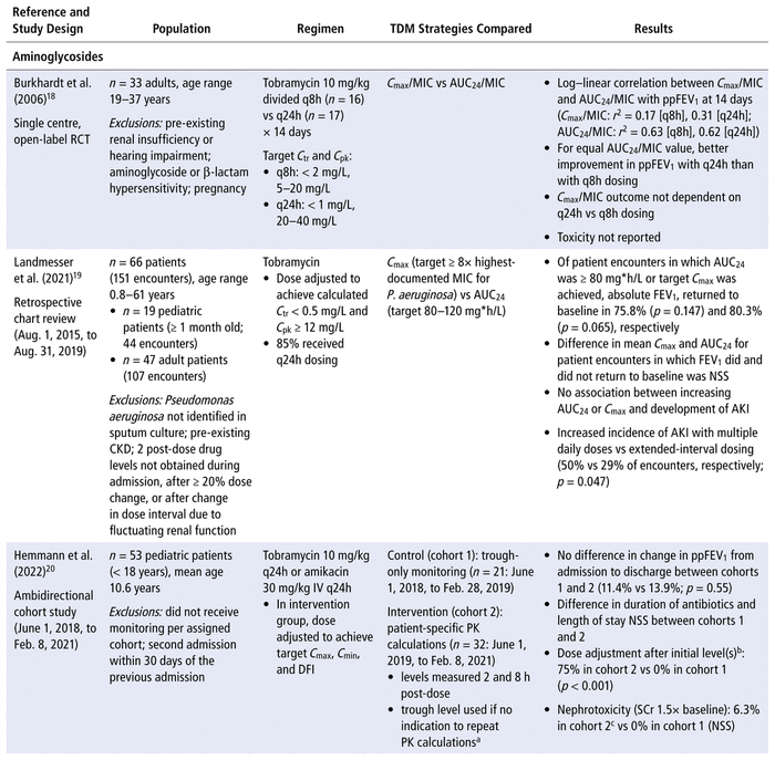 20 Hemmann B, Woods E, Makhlouf T, Gillette C, Perry C, Subramanian M, et al. Impact of patient-specific aminoglycoside monitoring for treatment of pediatric cystic fibrosis pulmonary exacerbations. J Pediatr Pharmacol Ther. 2022;27(7):655–62.