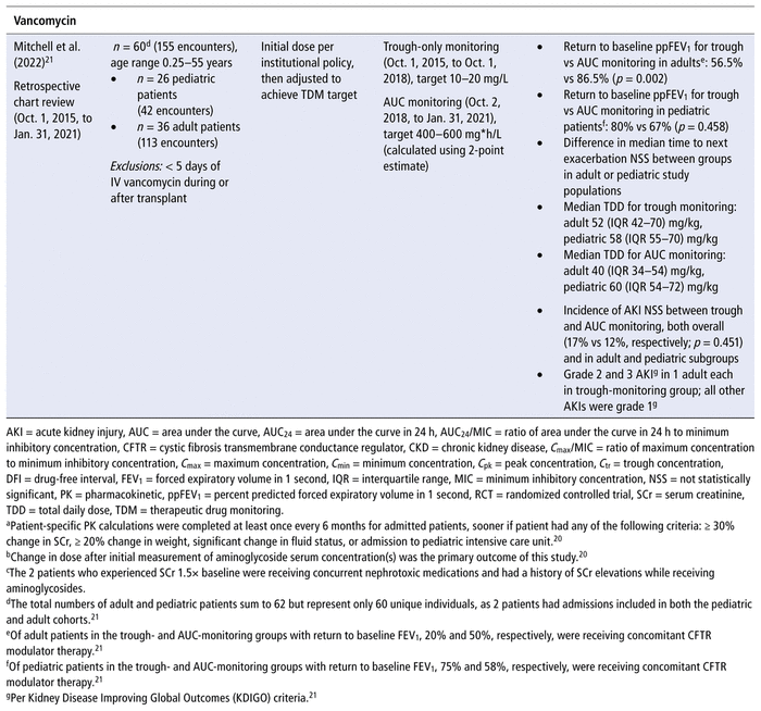 21 Mitchell B, Kormelink L, Kuhn R, Schadler A, Autry E. Retrospective review of vancomycin monitoring via trough only versus two-point estimated area under the curve in pediatric and adult patients with cystic fibrosis. Pediatr Pulmonol. 2022;58(1):239–45.