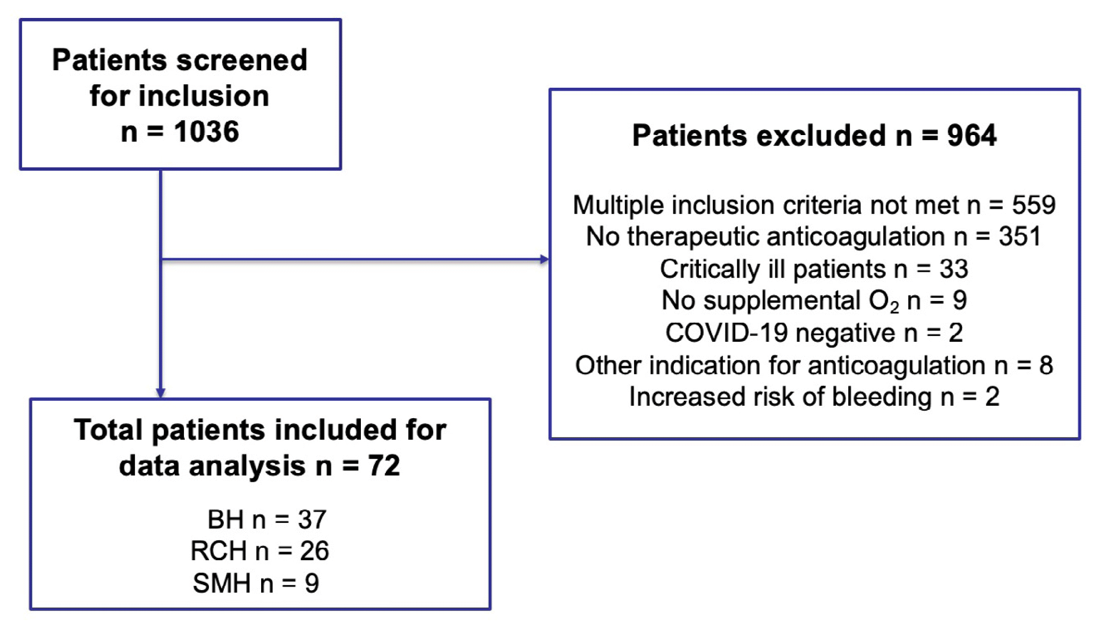 A convenience sample size of 100 participants was targeted, and participants were randomly screened for eligibility until this sample size was achieved. Only patients admitted on or after April 1, 2021, were included, as this date aligns with the implementation of the BC CTC recommendation to use therapeutic anticoagulation for thromboprophylaxis in patients with severe COVID-19 and low bleeding risk.