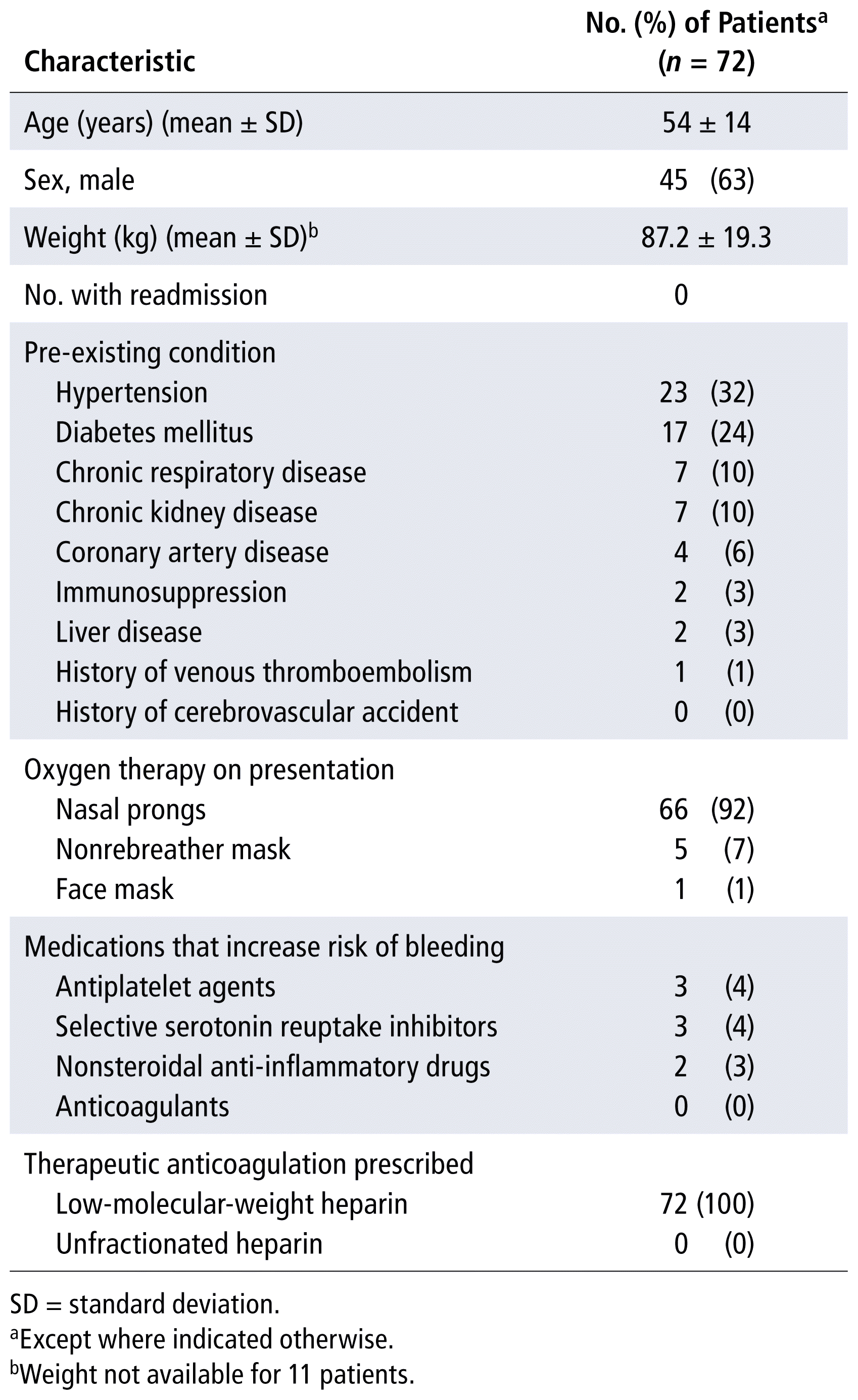 The study population was determined by means of cross-referencing independent computer-generated reports from the patient records system. One report, from the Fraser Health Authority’s pharmacy informatics department, was programmed to identify all adult patients (≥ 17 years old) admitted to a medical unit who received care according to the COVID-19 preprinted order sets. The other report, from the Fraser Health Authority’s health records department, was programmed to identify all adult patients admitted to a medical unit with laboratory-confirmed COVID-19. Eligible patients were those with a confirmed diagnosis of COVID-19 (positive for SARS-CoV-2) and severe disease requiring supplemental oxygen therapy above baseline requirements who had been started on therapeutic anticoagulation with LMWH or unfractionated heparin within 72 hours after hospital admission and continued for at least 48 hours. We included patients with laboratory-confirmed COVID-19 based on a positive result on polymerase chain reaction testing at the time of admission to hospital or in the community before admission. Patients with a negative result on COVID-19 testing at the time of admission were included if they tested positive during their admission and were subsequently treated (within 72 hours of the positive result) with at least 48 hours of therapeutic anticoagulation with LMWH. Severe COVID-19 was defined as disease not requiring organ support, such as high-flow nasal cannula (HFNC), vasopressor/inotropes, extracorporeal membrane oxygenation, or invasive or noninvasive ventilation. Potential participants were excluded if they had a high risk of bleeding (age ≥ 75 years, estimated glomerular filtration rate < 30 mL/min, platelet count < 50 × 109/L, receipt of dual-antiplatelet therapy, serious gastrointestinal bleeding or intracranial condition within the past 3 months, epidural or spinal catheter), a high risk of bleeding into a critical site, active bleeding of clinical significance requiring intervention, known major bleeding disorder, or acquired coagulopathy; if they were already receiving therapeutic anticoagulation for another indication; or if they had known heparin allergy, including heparin-induced thrombocytopenia. The hospital’s electronic records for eligible patients were reviewed to collect baseline data, as well as data for the primary and secondary outcomes with the use of a standardized data collection table, as agreed upon by the research team.