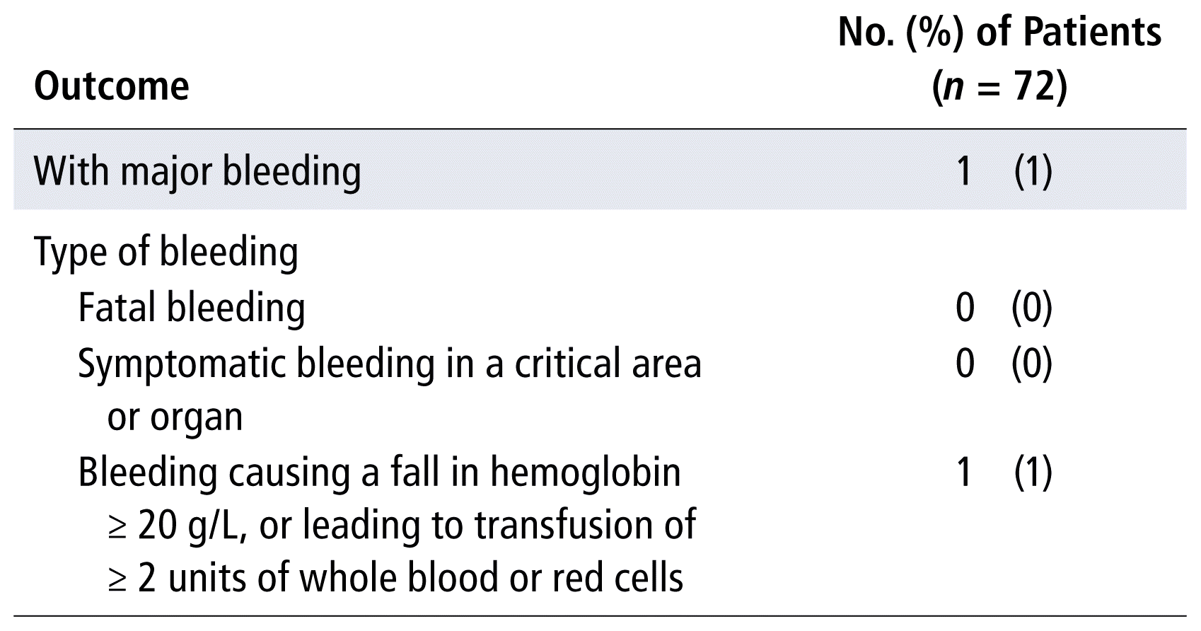 We found a low occurrence of both major bleeding and thrombotic events among patients hospitalized with severe COVID-19 who, upon admission, had a low risk of bleeding and were subsequently treated with therapeutic anticoagulation. A previous multiplatform trial, which was to date the largest trial evaluating therapeutic anticoagulation in inpatients with COVID-19, reported a 1.9% rate of major bleeding.6 Similarly, in the HEP-COVID and RAPID trials, the rates of major bleeding among inpatients with COVID-19 who were receiving therapeutic anticoagulation and were admitted to medical wards were 2.4% and 0.9%, respectively.13,14 In the current study, just 1 (1%) of 72 patients experienced major bleeding during treatment with therapeutic anticoagulation, which aligns with the rates in these previous trials and may indicate that our patient population had a similar risk of bleeding with therapeutic anticoagulation. Furthermore, the single episode of major bleeding in our study occurred 13 days after discontinuation of therapeutic anticoagulation; as such, there is a low likelihood that this bleed was related to the course of therapeutic anticoagulation.
