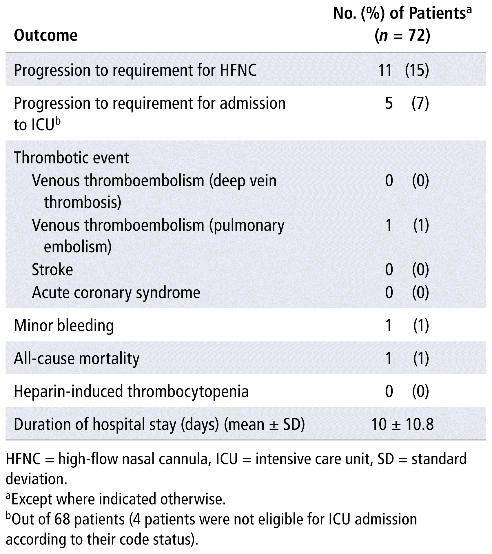 After screening of 1036 patients, 72 patients were included in the study. The mean age of participants was 54 years, 63% (n = 45) were male, and 92% (n = 66) were receiving supplemental oxygen by nasal prongs on admission. The primary outcome, major bleeding, was experienced by 1 patient (1%). Increasing oxygen requirements resulting in progression to high-flow nasal cannula occurred in 11 patients (15%), and 5 patients (7%) required admission to the intensive care unit. One patient (1%) experienced a thrombotic event, and 1 patient (1%) had a minor bleed. The mean duration of hospitalization was 10 (standard deviation 10.8) days. One death occurred during the study period, and no cases of heparin-induced thrombocytopenia were observed.
