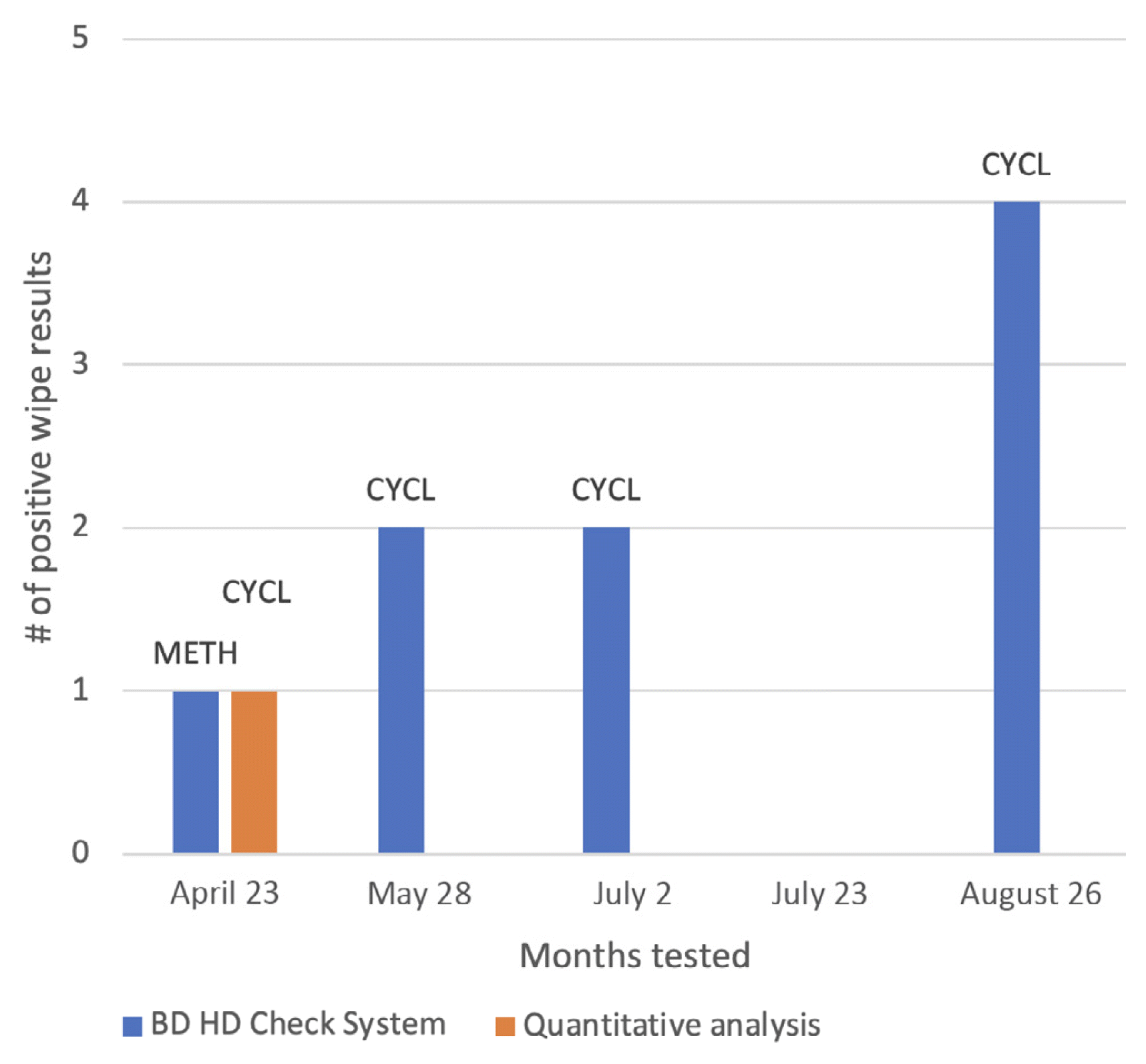 At the time of manuscript preparation, the cost of adding regular qualitative testing to the standard quantitative testing protocol was $72.50 per wipe per drug tested. The total added cost per time period would depend on how often qualitative testing was desired (e.g., once per month, once every 2 months) and the number of spills for which surface sampling was required during that particular period.