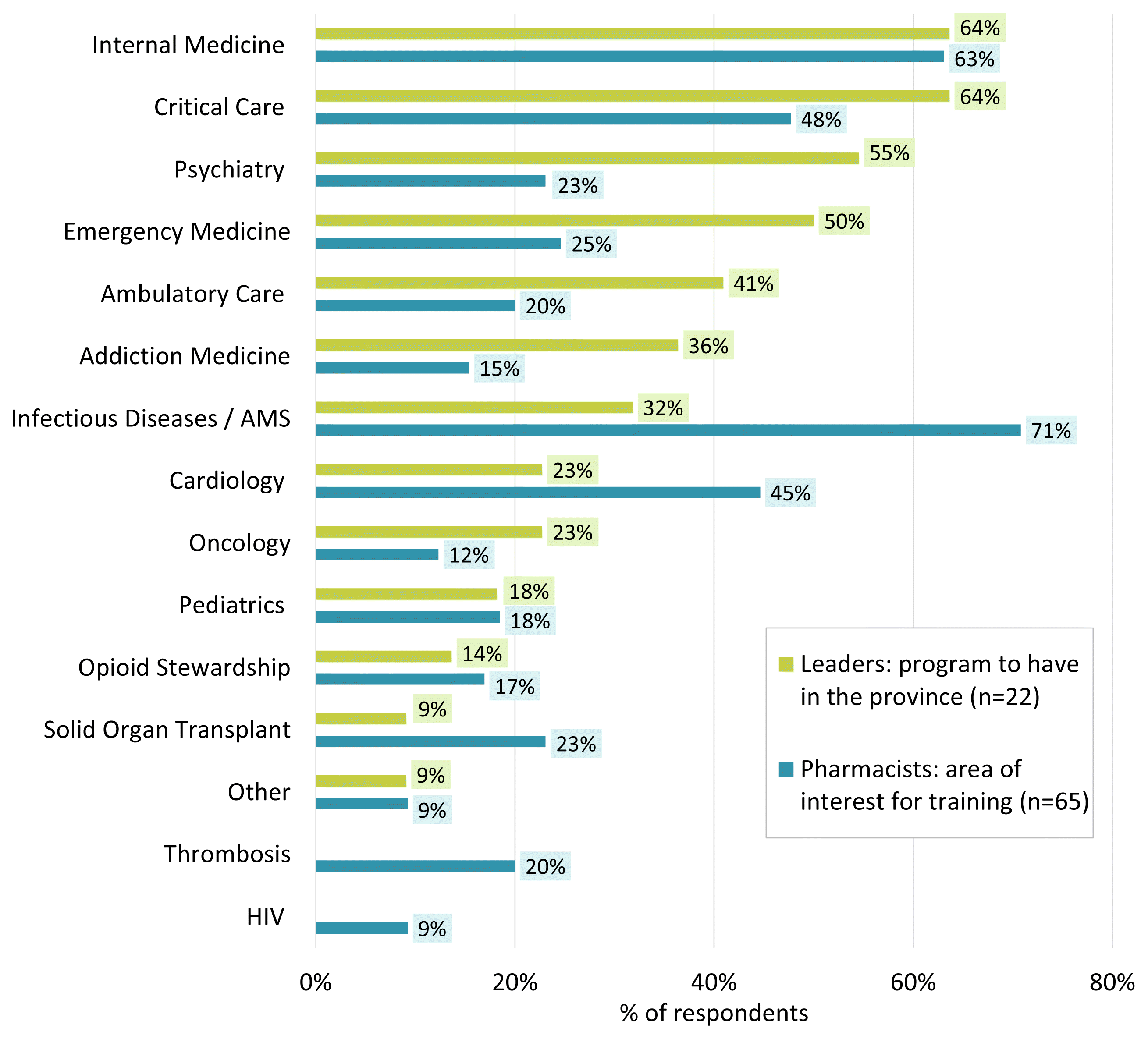 ECPs who were interested in or undecided about pursuing advanced training were asked to select up to 5 specialty areas in which they would be interested in training, and pharmacy leaders were asked to choose specialty areas according to the current and future needs of their departments and patients. Internal medicine and critical care were highly desired among both groups (Figure 1), and ECPs also favoured infectious diseases/antimicrobial stewardship and cardiology.