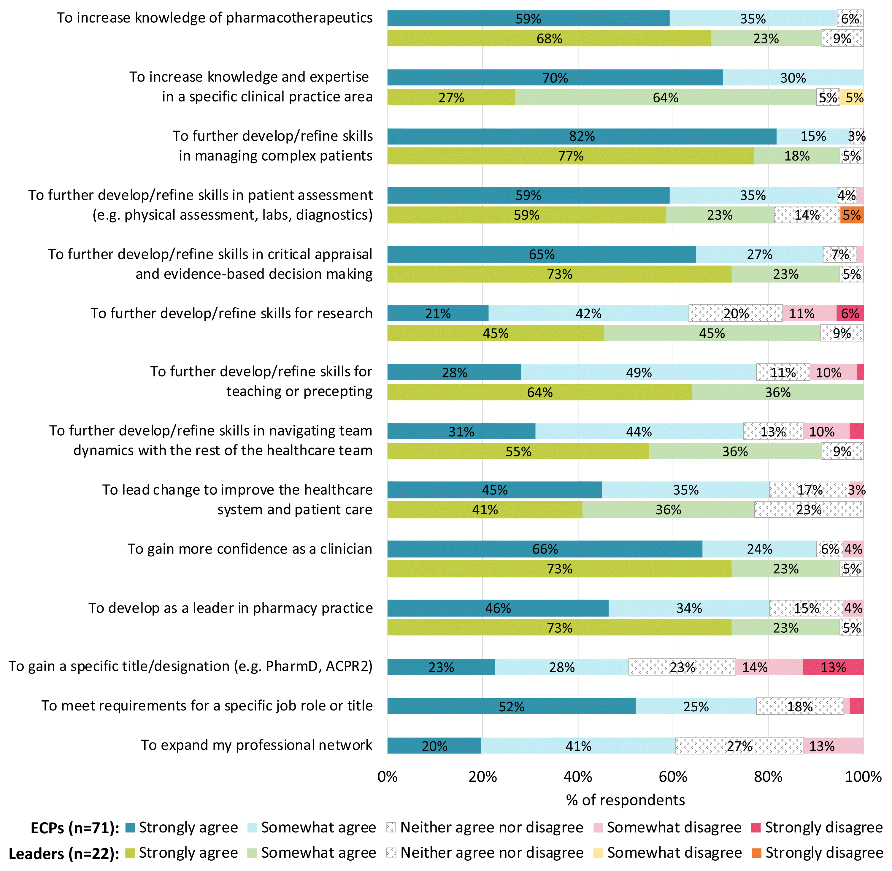 Pharmacy leaders and ECPs somewhat agreed or strongly agreed that various clinical skills and knowledge were desired educational competencies and motivators for pursuing advanced training. Specifically, these skills included increasing or improving pharmacotherapeutic knowledge, skills in patient assessment, critical appraisal and evidence-based decision-making, and management of complex patients (Figure 2). Acquiring specific job qualifications was also a major motivator for ECPs. Leaders also valued research skills, teaching skills, navigating team dynamics within the health care team, and developing as a leader in pharmacy practice.