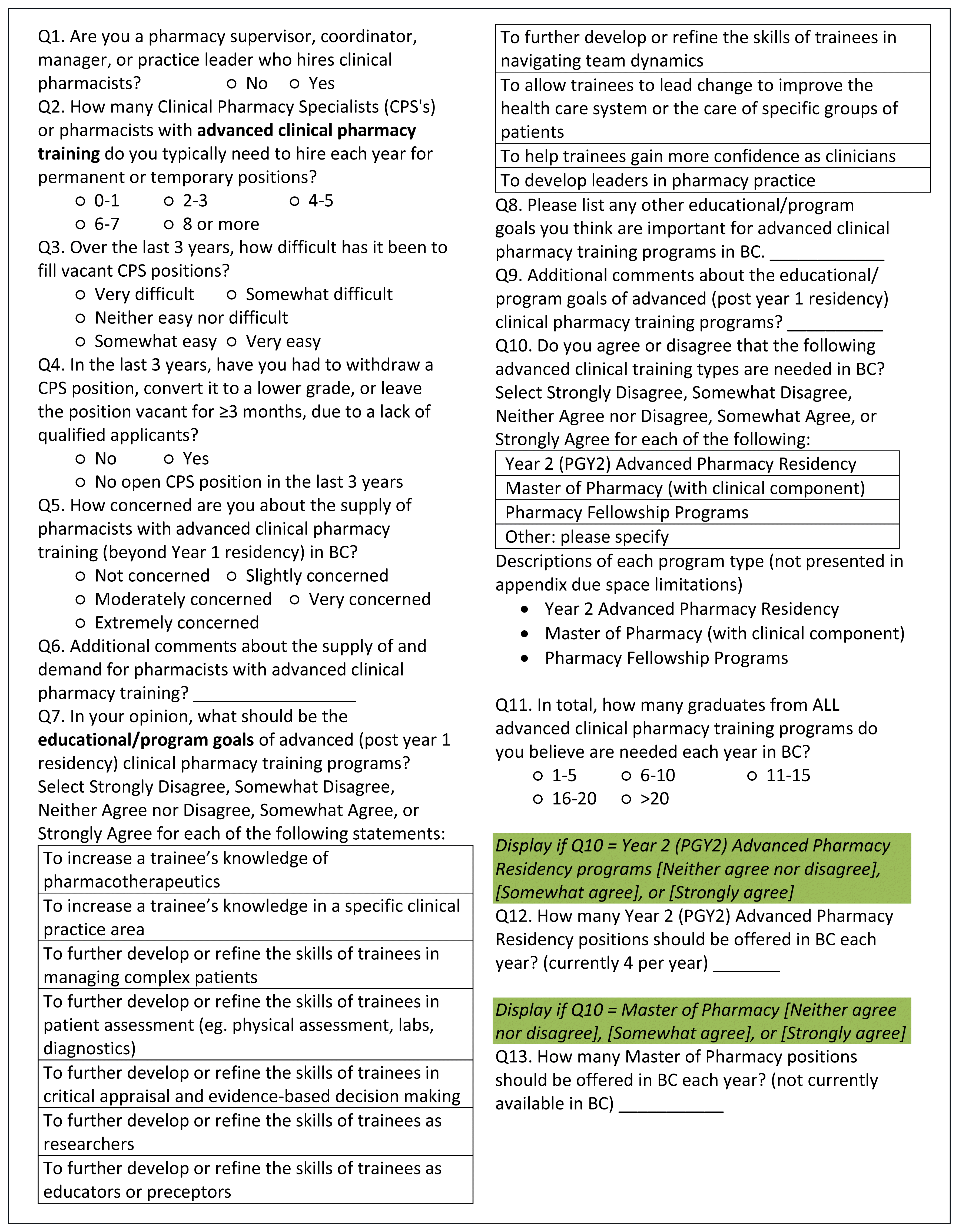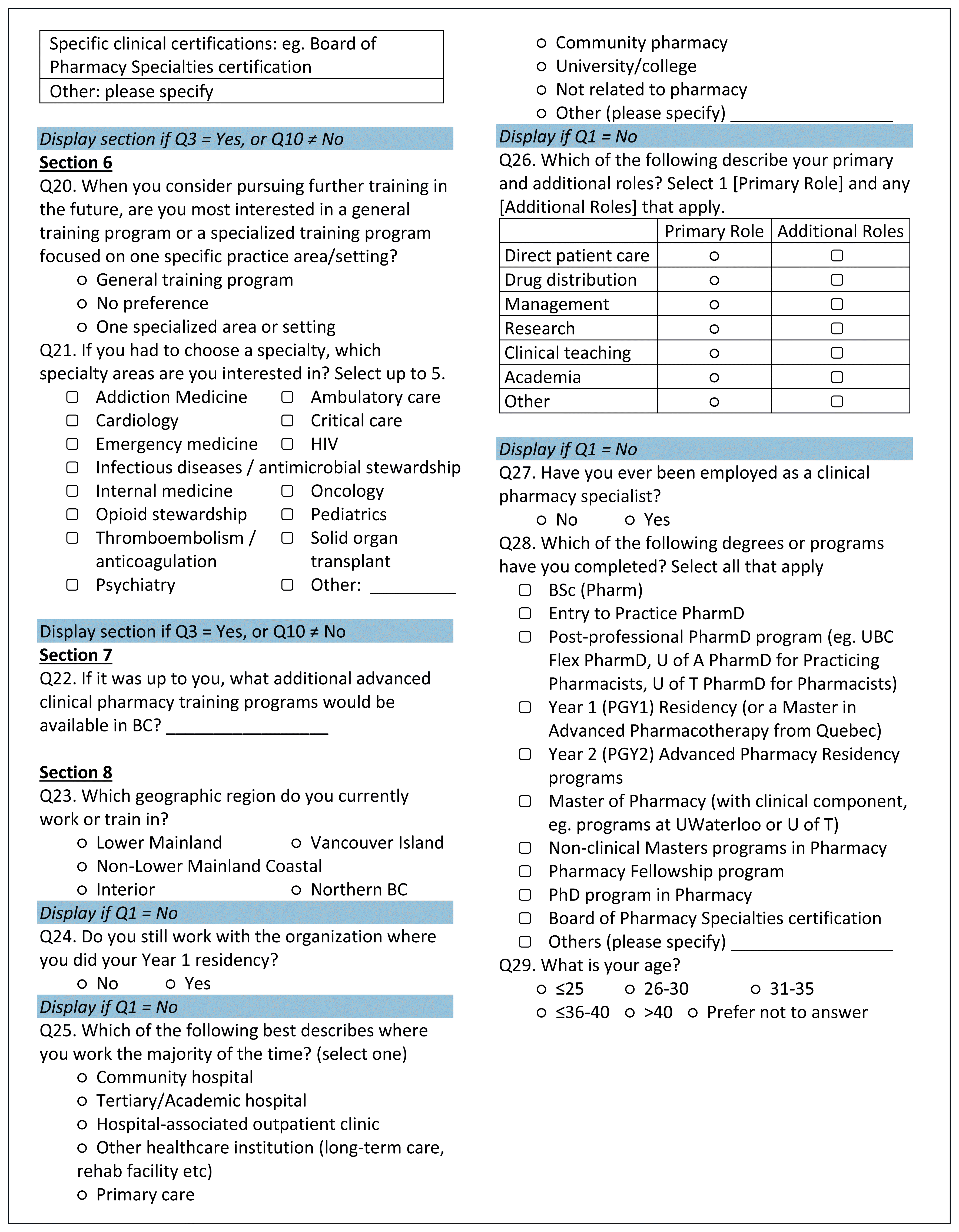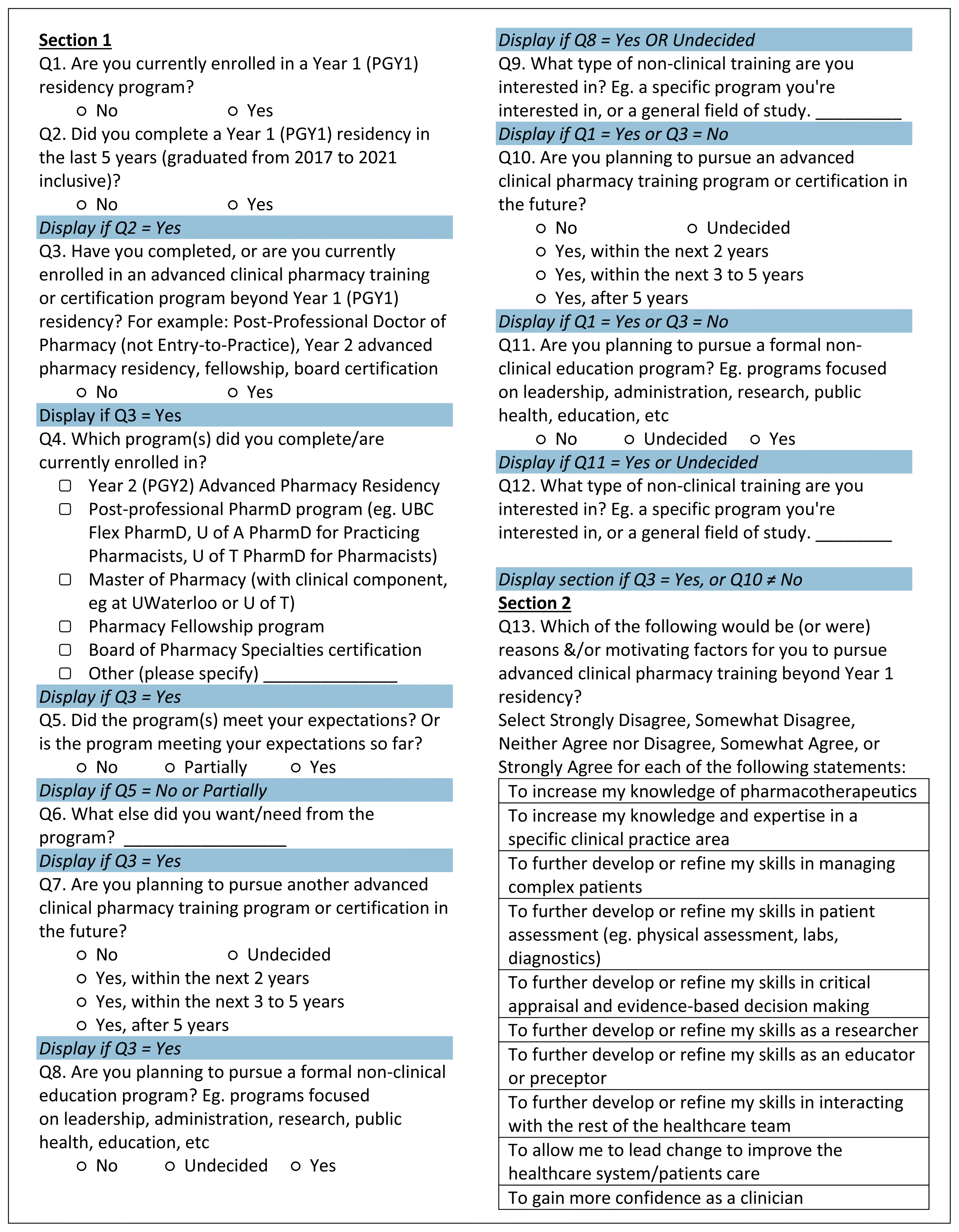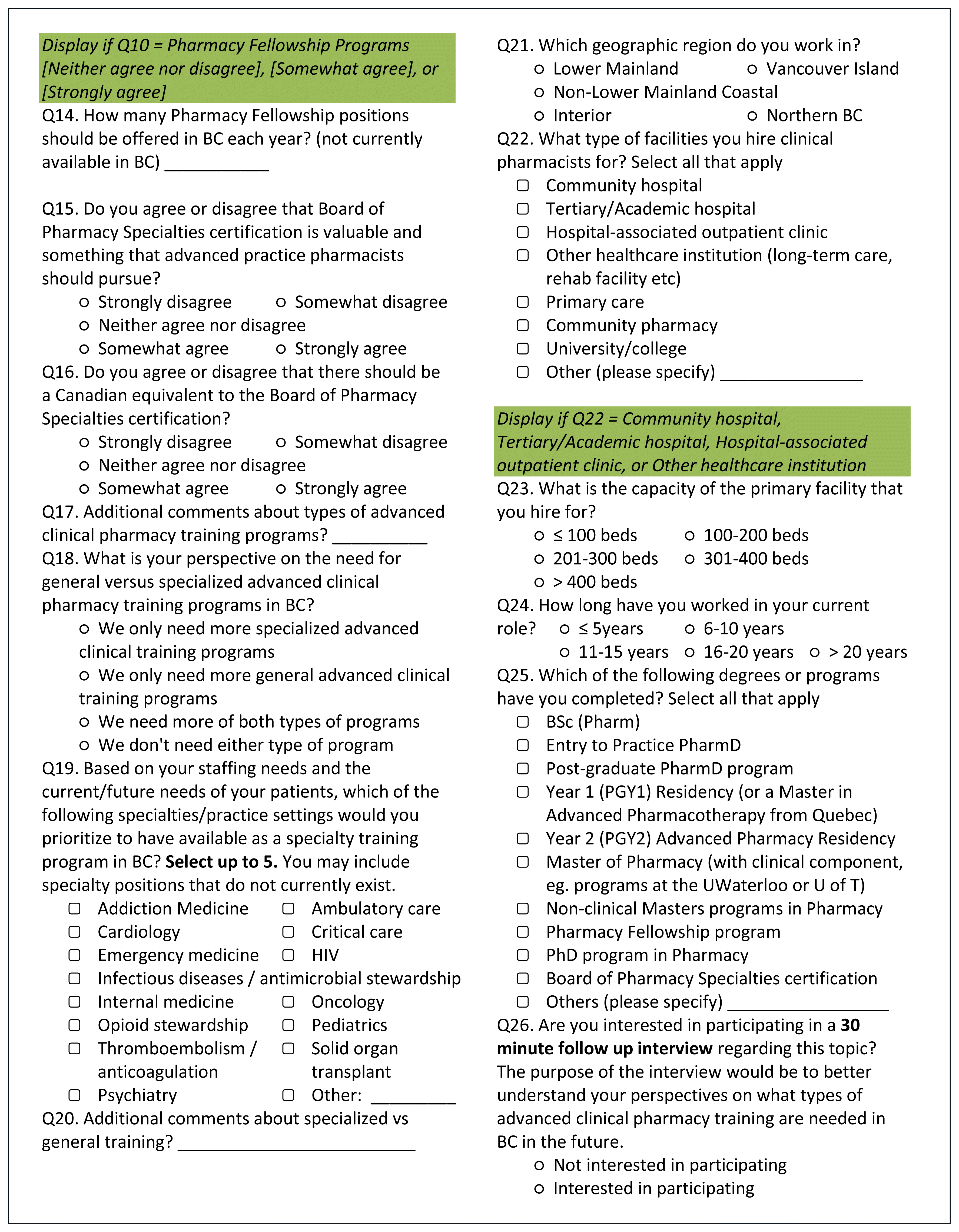 This mixed-methods study, using surveys and semistructured key informant interviews, involved 2 groups of participants. The first group consisted of early career pharmacists (ECPs), who were defined as current pharmacy residents (i.e., in the 2021/22 academic year) or pharmacists who had graduated from a hospital residency or similar Quebec Master’s program within the previous 5 years (2017 to 2021 inclusive) and were working within one of British Columbia’s health authorities. The cut-off of 5 years was selected as it was felt that this group was most likely to be interested in pursuing additional clinical pharmacy training. The second study group consisted of pharmacy leaders working within British Columbia health authorities, whose responsibilities included the hiring of clinical pharmacists. Pharmacy leaders were included in the study to offer the perspective of stakeholders who would be evaluating the qualifications of pharmacist applicants when hiring for advanced positions in their workplace.