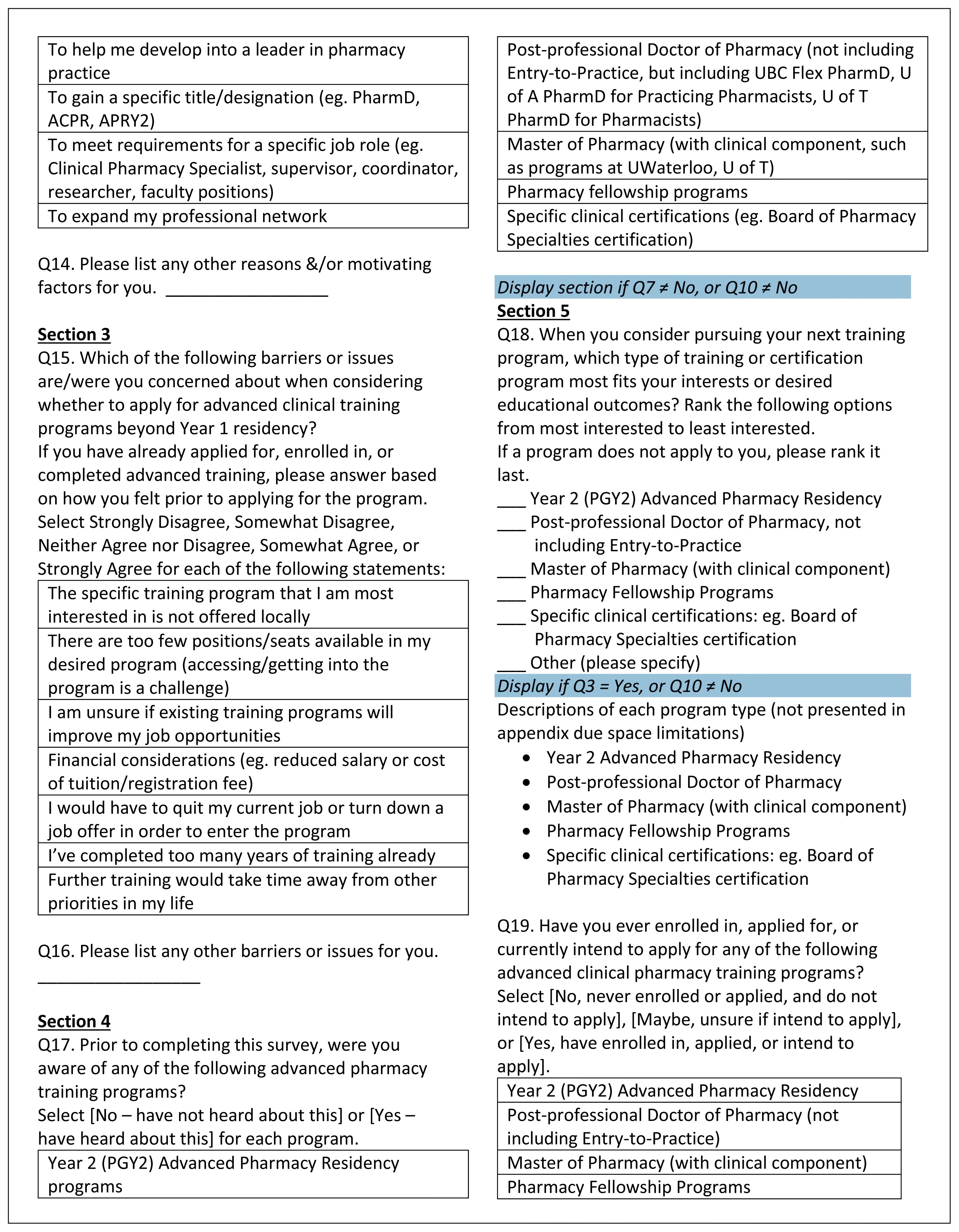In studies conducted in the United States over the past decade, pharmacy residents have reported various motivators for pursuing postgraduate training, including gaining knowledge, experience, and confidence5,6; gaining research skills6; preparing for the evolving role of pharmacists5; and meeting job requirements.7 Studies of pharmacy students in Canada and the United States over the same period have found similar results. Gaining knowledge and experience8,9 and the belief that residency would help the students achieve their career goals10 were common motivators. Conversely, financial constraints,5–9,11 jobs available without further training,5–8 family obligations,11 and concerns about succeeding in a challenging program8,11 were commonly cited as barriers or demotivating factors for residents and students. There is a lack of Canadian research related to post-Y1 advanced clinical pharmacy training, particularly since the shift to entry-level PharmD programs. Such information may inform the further development of advanced clinical pharmacy training programs.