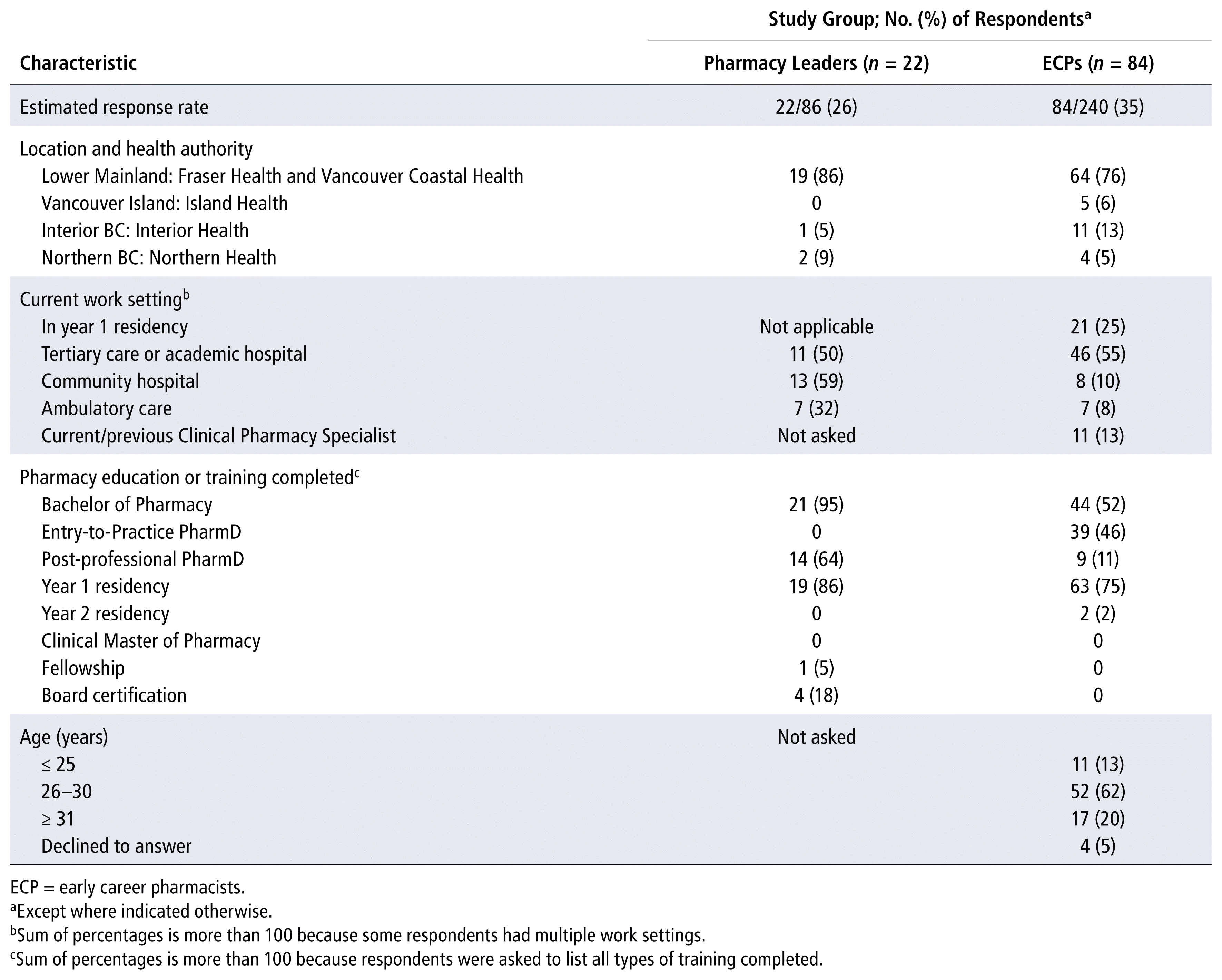 Twenty-two pharmacy leaders and 84 early career pharmacists participated in the surveys (Table 1). The estimated response rates were 26% and 35%, respectively. We could not determine the number of people who received the study invitation, so the estimated response rates are based on estimates of the numbers of pharmacy leaders and ECPs in British Columbia. Most participants worked in the Lower Mainland region (which includes the Greater Vancouver area), but there was also representation from other parts of the province.