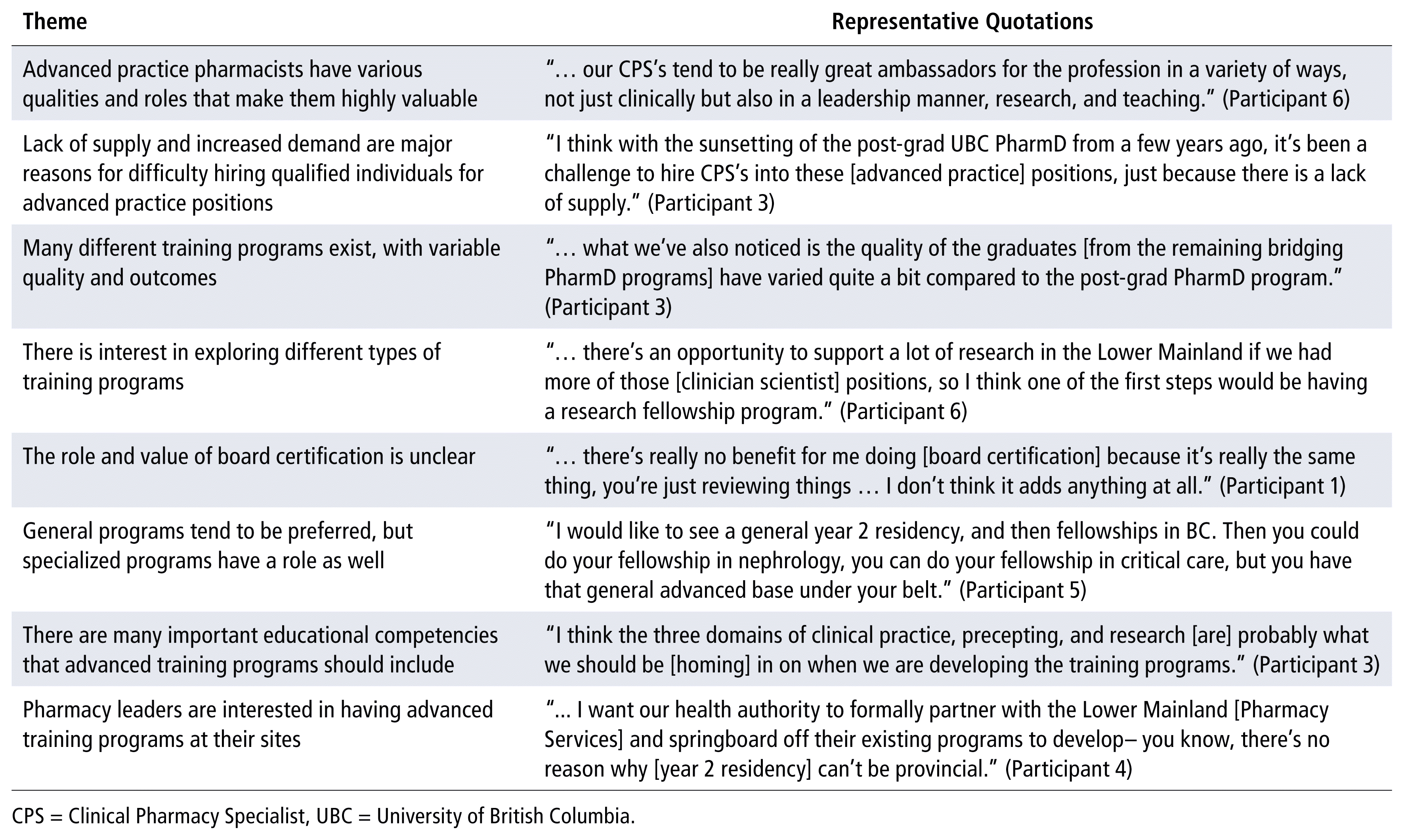 All 6 interview participants expressed that pharmacists with advanced training have qualities and responsibilities that make them valuable members of the health care team. Although 1 participant had not experienced any difficulty in hiring advanced practice pharmacists in recent years, all participants recognized that there is now an increased demand for and a lack of supply of pharmacists with advanced training in British Columbia. Three leaders expressed confusion about the various training programs currently available in Canada, and all 6 cited the variable quality and outcomes produced by these programs as a consideration when hiring for advanced practice positions. Four participants expressed an interest in exploring different training models, and 5 preferred general training programs over specialized programs because they provide transferable skills and flexibility for hiring purposes. Two leaders suggested that specialized programs could be pursued after completion of a general program. All participants agreed that advanced patient care skills and research were key educational competencies for advanced training programs, whereas they did not consistently agree upon the value of teaching and leadership skills in such programs. Two leaders commented that although it is important to develop leadership skills, they should be secondary to clinical competencies. One mentioned that pharmacists who wish to work as administrators or managers could also consider specific leadership training programs.