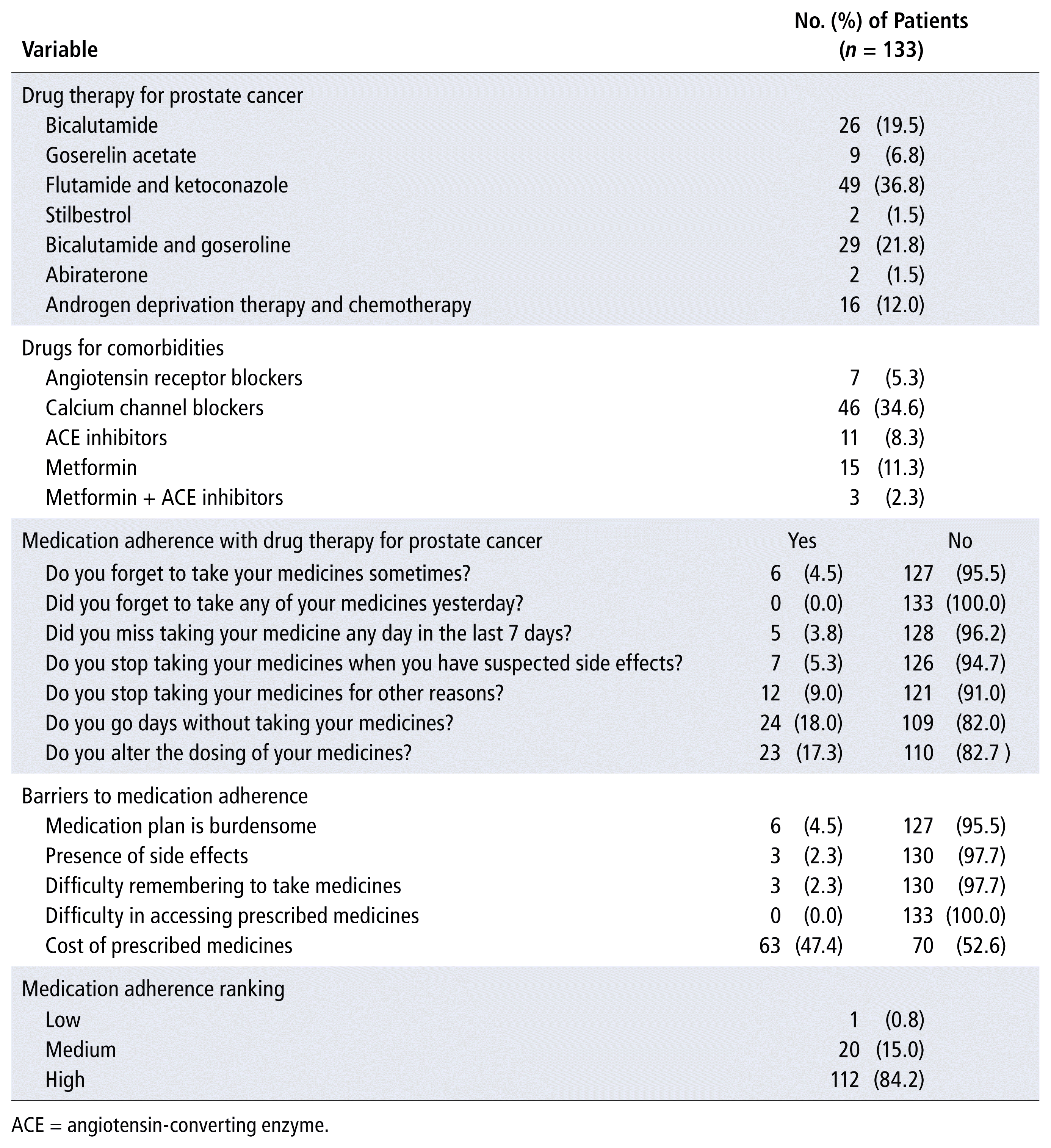 To determine patients’ medication adherence, the predictors of adherence, and the frequency and types of adverse drug reactions (ADRs) in persons with prostate cancer.