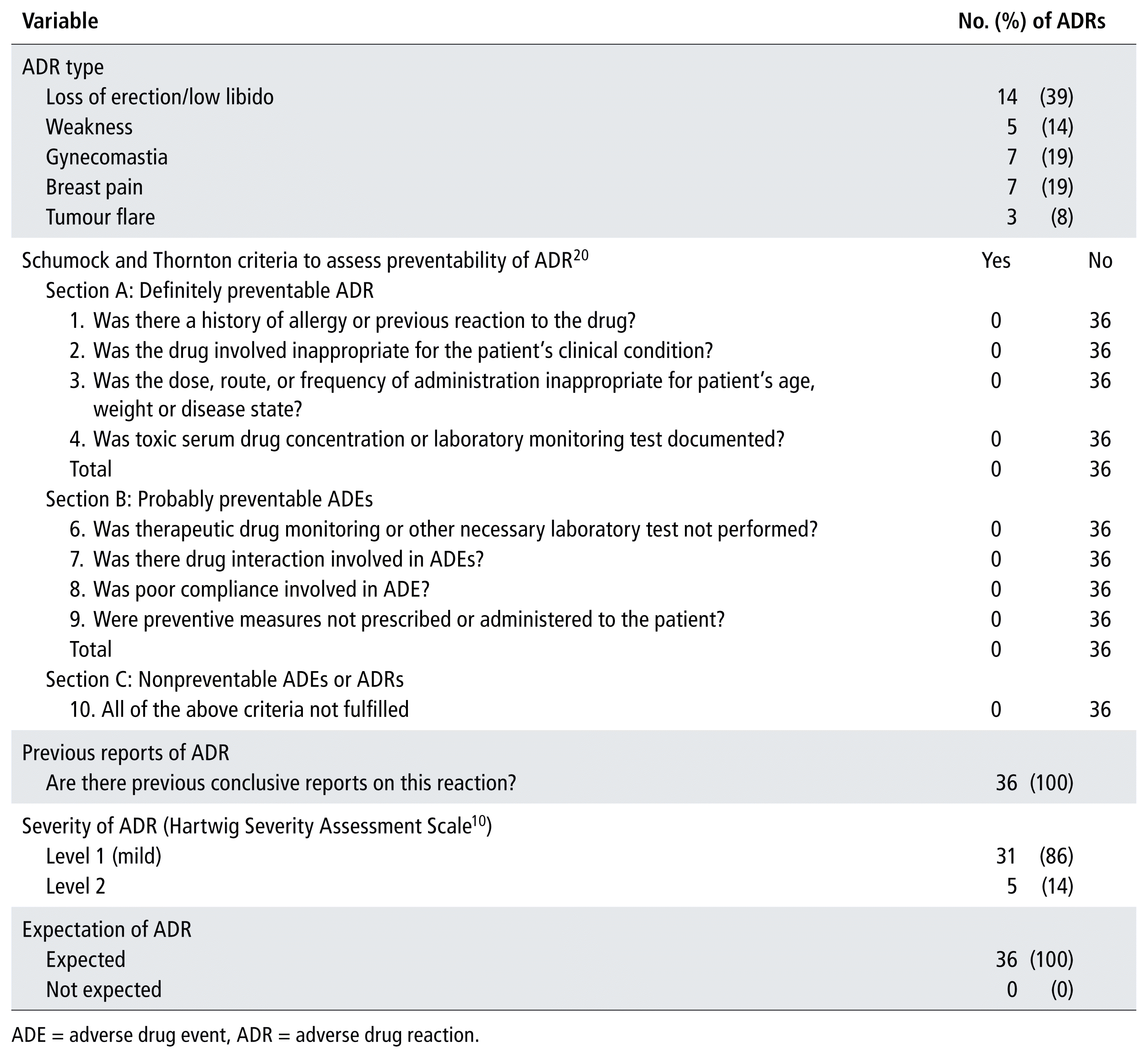 All of the ADRs that occurred were expected and nonpreventable, and most had level 1 severity, as assessed by the Hartwig severity assessment scale.10 Level 1 ADRs are mild, requiring no change in therapy with the suspected drug. In contrast, most ADRs in previous studies in Nigeria and Nepal, which involved persons with various cancer types, were classified as moderate.8,30 This between-study difference in the severity of observed ADRs is likely related to the differences in cancer types studied: the previous studies included all cancer types and their associated chemotherapies, whereas our study focused on prostate cancer. Therefore, pharmacodynamic and pharmacokinetic differences between the prostate cancer drugs and those used in other types of cancer are likely responsible for the differences in severity of ADRs. Overall, our findings suggest that the prostate cancer drugs were well tolerated by the study participants.