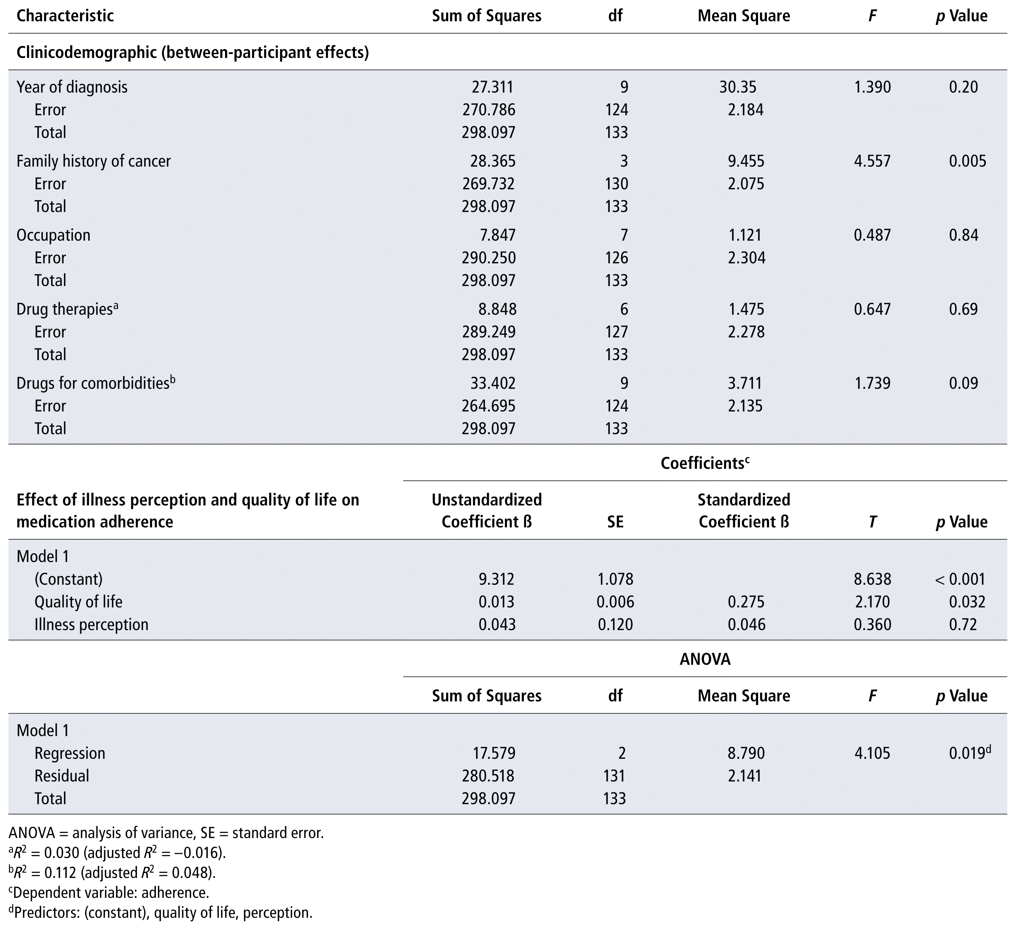 A family history of cancer had a significant effect on medication adherence (df = 3, F = 4.557, p = 0.005). Therefore, medication adherence was significantly dependent on the patient’s family history of cancer (Table 2).