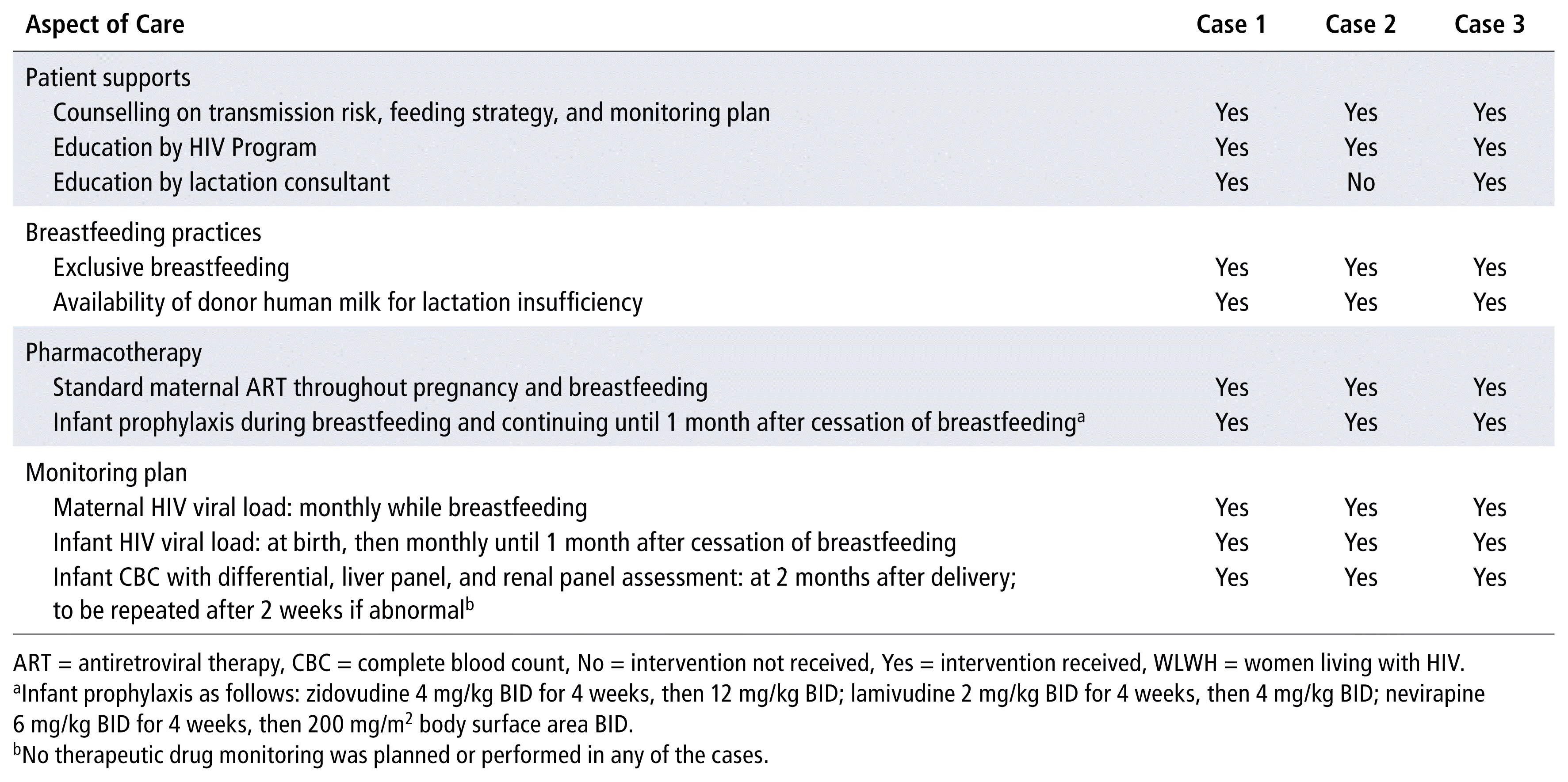 The cases reported here demonstrate the importance of supporting WLWH in making informed decisions about infant feeding without judgment or bias, as well as the value of strong trusting relationships between each patient and their practitioners. Such ongoing relationships are valuable to ensure that patients feel secure in disclosing their personal situations and the challenges they have encountered during breastfeeding. The various complications described in these cases highlight the importance of educating health care team members and parents well in advance of delivery, and the need for comprehensive follow-up to support WLWH who choose to breastfeed. Although initial education about breastfeeding and risk of HIV transmission is imperative for all involved, ongoing reinforcement of knowledge is needed to ensure clarity and understanding of concepts and to avoid misinterpretation and clinical complications.