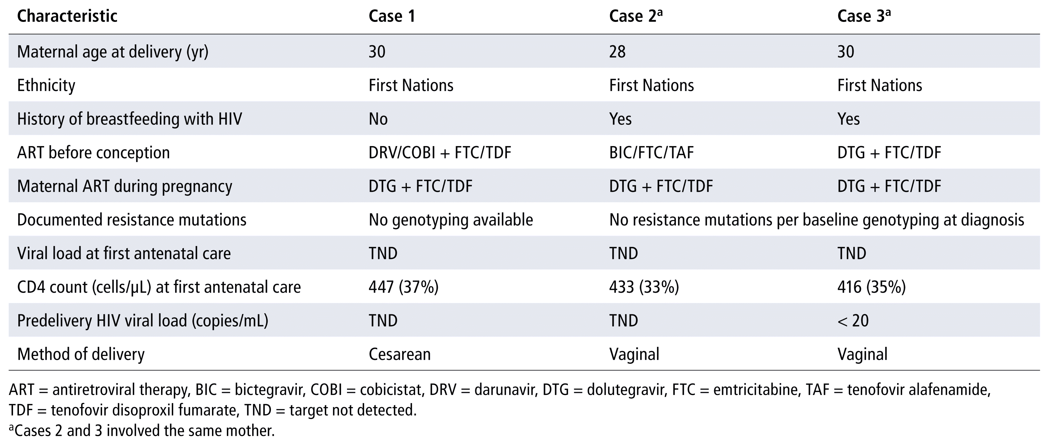 The second and third cases relate to 2 pregnancies involving the same mother of First Nations descent with a past medical history of stimulant use disorder, anxiety, depression, and PPD; the previous experience of PPD had resulted in a return to stimulant use. Although there was known difficulty with adherence to ART, the mother’s HIV viral load remained consistently suppressed before conception and throughout both pregnancies. Her expressed motivations to breastfeed included a desire to bond with her infants and a desire to ameliorate the risk of PPD and return to substance use. She also reported that she had breastfed her prior infant, although this history had not previously been disclosed to the health care team.