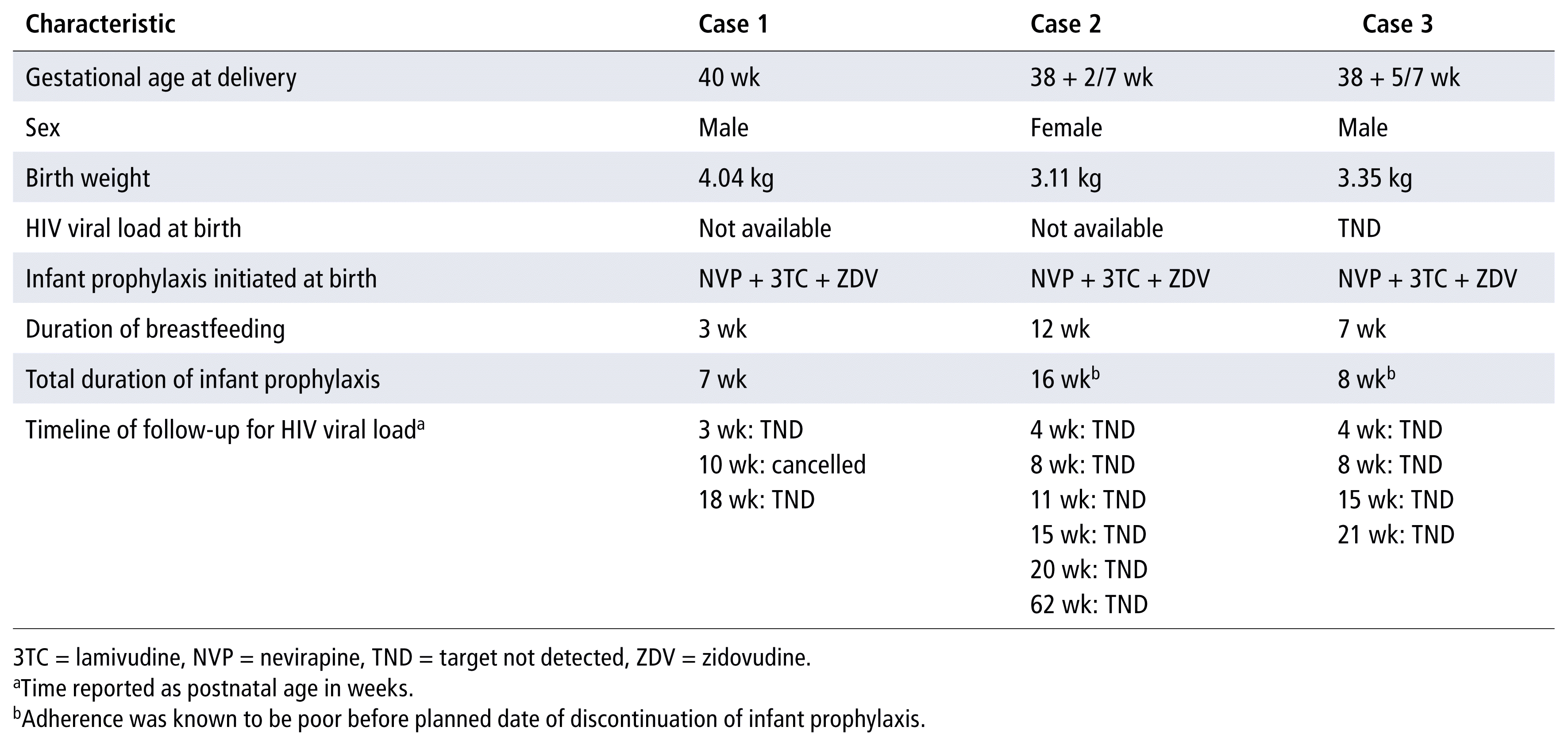 In accordance with recommendations from the pediatric infectious diseases specialist or specialists involved in each case, the infants were to be exclusively breastfed and were to receive combination ART (termed infant prophylaxis) consisting of nevirapine, lamivudine, and zidovudine while breastfeeding and for 1 month after cessation. Mixed feeding (with a combination of breast milk and formula) was to be avoided due to a theoretical increased risk of postnatal transmission. Donor human milk (DHM) was available as needed in all cases described here, with coverage of costs supported through the institution’s HIV program.
