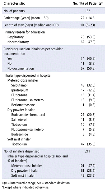 During the 3 months of the study, 140 eligible patients had at least 1 inhaler dispensed from the hospital pharmacy. Following requests for paper charts, 8 patients were excluded from the study: 5 patient charts were stored off site and were not accessible in the available timeframe; 2 patients remained in hospital at the time of data collection, with paper charts unavailable through medical records; and 1 patient did not have dispensing of an inhaler documented on their MAR for the duration of their admission. Patient demographic characteristics and information about inhalers dispensed were recorded for all 132 patients (Table 1).