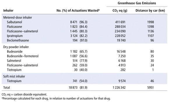 In this study, 23 031 actuations (211 inhalers) were dispensed for 132 patients. Of these, 81.9% were wasted, at a total cost of $6172.82 over the 3 months of the study. For 22 patients (16.7%), at least one inhaler was dispensed, yet no doses were administered; for 16 (12.1%), a duplicate inhaler was dispensed. The carbon footprint of the wasted doses was 1 226 342 g carbon dioxide equivalent, equivalent to driving 5951 km by car.