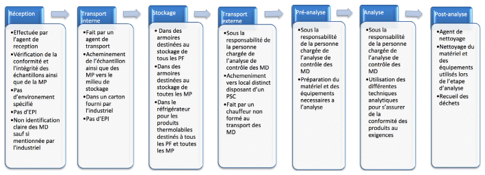Les étapes du processus d’intérêt sont décrites par la figure 1 sous forme de diagramme de flux. Le processus de contrôle des MD a été divisé en 4 étapes, à savoir : réception, transport, analyse des produits finis (PF) ainsi que la gestion de leurs déchets. L’étape de transport a été divisée en transport interne et externe dans le diagramme, le stockage fait partie de l’étape de réception et le processus pré-analyse fait partie intégrante de l’étape analyse des PF.