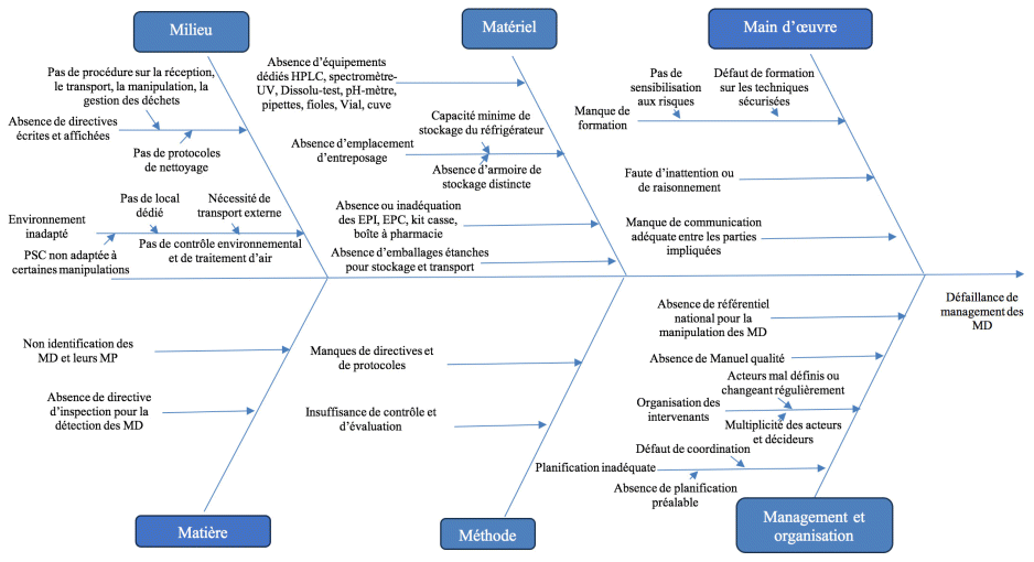 Les causes de défaillances sont détaillées dans le tableau 2 étape par étape. Elles concernaient essentiellement : l’absence d’identification des MD, l’absence de formation du personnel sur les bonnes pratiques de manipulation des MD et l’absence de procédures écrites et affichées détaillant la technique à suivre à chaque étape du circuit des MD. Elles sont représentées sous forme d’un diagramme « cause-effet » dit d’Ishikawa (figure 2).