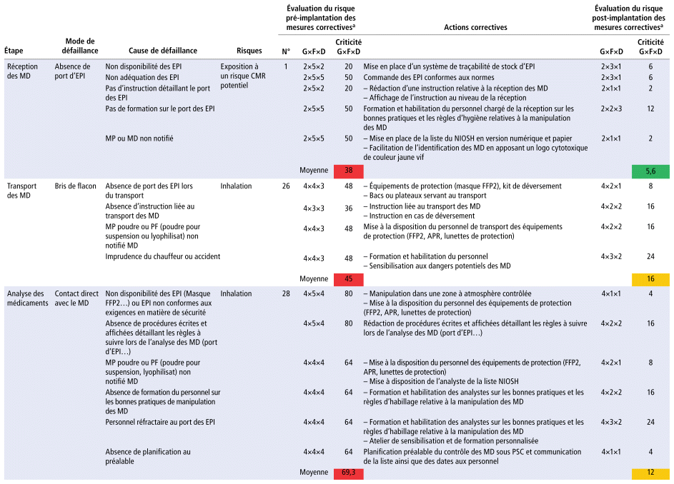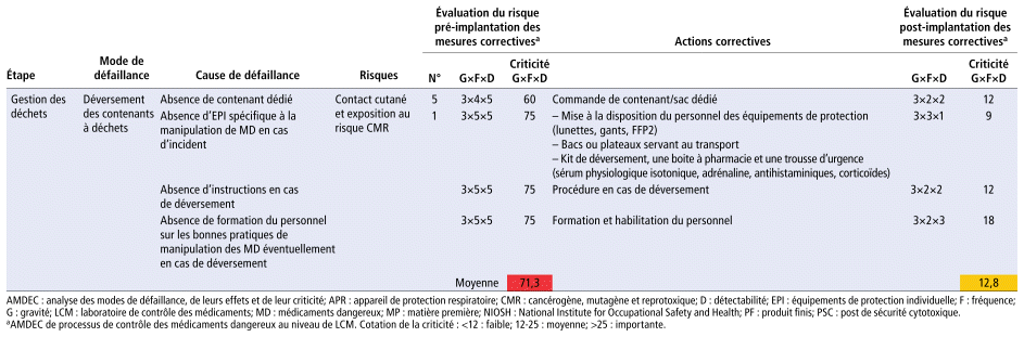 La détermination des points critiques a permis de définir les priorités d’action. Le tableau 2 rapporte les différentes actions correctives proposées. Ces mesures étaient réparties en plusieurs actions qui ont été priorisées en fonction de la criticité des modes de défaillance mais aussi de leur faisabilité et des besoins en ressources associées. Parmi elles, on peut dénombrer la mise à disposition d’équipements de protection individuelle (EPI) et d’équipements de protection collective (EPC) spécialisés. La formation du personnel a permis l’engagement de groupe et la prise de conscience collective et était définie dans le plan d’amélioration continue. La rédaction de procédures et d’instructions a clarifié certaines étapes, a favorisé l’acceptabilité et a diminué les peurs qui pouvaient exister quant à la manipulation de ces produits. La mise à disposition de la liste NIOSH sous format papier et numérique a facilité l’identification des MD au niveau de la réception et l’information des analystes. Certaines mesures étaient simples à mettre en place (entreposage dans des armoires séparées des autres PF ou d’autres substances de références, mise à disposition de bacs de transports, impression de logo de signalisation du danger CMR), faciles et n’ont pas nécessité l’augmentation du budget. Néanmoins, certaines autres actions étaient difficiles à mener et ont nécessité un temps de commande assez long : achats de gants de protection contre les MD, masques FFP (filtering facepiece), littéralement « pièce faciale filtrante », avec une capacité de filtration de 94 % et 99 % pour le FFP2 et le FFP3, respectivement, surblouses, kit casse (une trousse qui permet de réagir rapidement au déversement afin de prévenir la contamination et les dommages éventuels), sacs poubelles et conteneurs destinés aux déchets des MD.