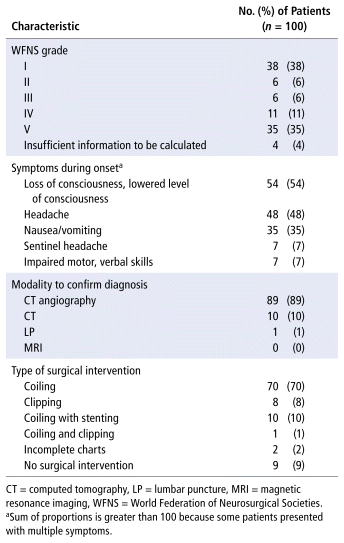A total of 636 patients with the ICD-10 code for nontraumatic subarachnoid hemorrhage were admitted to our site from January 1, 2012, to August 31, 2022. Of these, 100 patients were selected, by means of a random number system, for inclusion in our study. The median age was 59 (range 30–86) years, and 62 (62%) were female. Thirty-eight patients (38%) had an initial WFNS grade of I, and 35 (35%) presented with an initial WFNS grade of V, the most severe presentation. Common symptoms at presentation included loss or lowered level of consciousness (54%) and headache (48%). Seventy patients (70%) underwent coiling as the means of surgical intervention. Table 1 describes baseline characteristics in more detail.