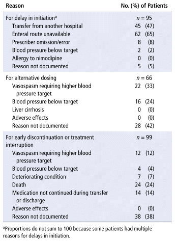 Among the 99 patients who did not receive the recommended course of nimodipine treatment, barriers were categorized as follows: delayed initiation (n = 95, 96%), receipt of alternative dosing regimens (n = 66, 67%), treatment interruption (n = 13, 13%), and early discontinuation (n = 86, 87%) (Table 2).