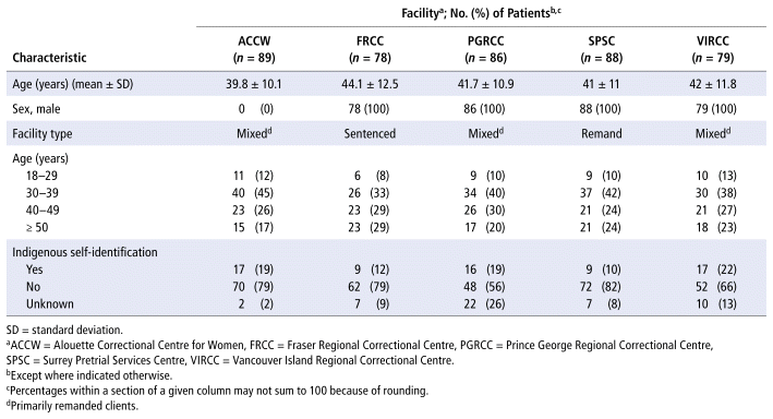 Of the 500 clients screened, 420 met the inclusion criteria for our analysis (Table 1); the remaining 80 were not taking any medications. Indigenous self-identification (First Nations, Métis, Inuit) ranged from 10% to 22% at each facility.