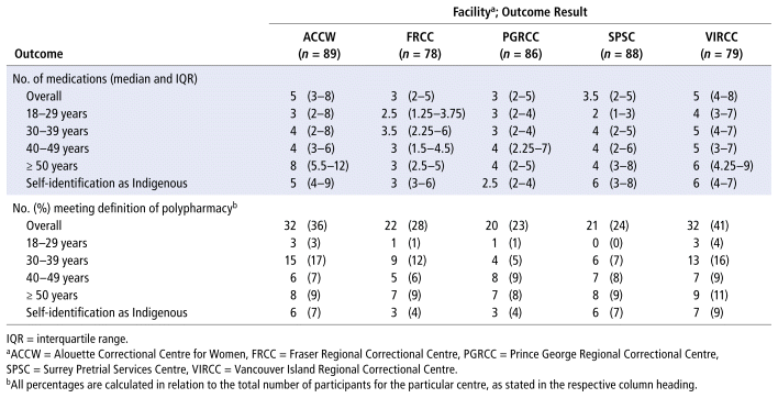 The median number of medications ranged from 3 to 5 per client (Table 2). VIRCC had the greatest proportion of clients with polypharmacy (41%), followed by ACCW (36%), FRCC (28%), SPSC (24%), and finally PGRCC (23%). Polypharmacy was most prevalent in the 30- to 39-year age group at ACCW, FRCC, and VIRCC, and among those 40 years of age or older at PGRCC and SPSC. Among those who self-identified as Indigenous, VIRCC had the greatest proportion with polypharmacy.
