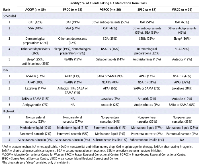 An observational point prevalence study of adult clients with one or more active medications on the census date at 5 correctional health facilities in British Columbia was conducted. Clients were excluded if they had one-time or no medication orders on the census date.