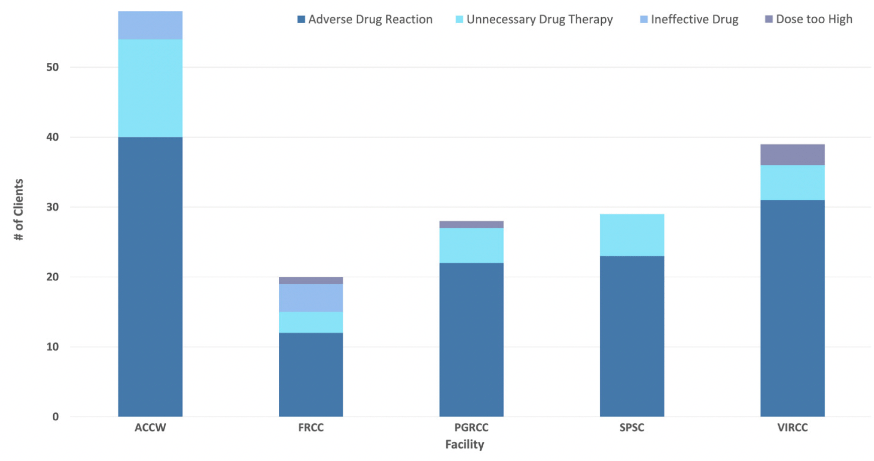 Of the 500 clients screened, 420 were included in the final analysis. Across the centres, the median number of medications ranged from 3 to 5 per client, and the rate of polypharmacy ranged from 23% to 41%. Of the scheduled medications, opioid agonist therapy and psychotropics were the leading categories prescribed across all facilities. Non-opioid analgesics were the top “as needed” medications prescribed at 4 of the 5 facilities. The leading potential drug therapy problem identified was drug interactions resulting in additive sedation.
