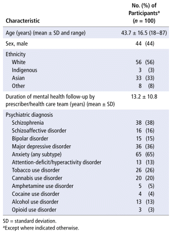 A total of 126 client charts were reviewed to reach the predefined sample size of 100 clients meeting the inclusion criteria. The remaining 26 client charts were excluded because these cases involved targeted questions relating to the client’s medication or were repeat referrals and therefore did not involve a comprehensive clinical pharmacist assessment. Client demographic and clinical characteristics are summarized in Table 1. The mean age of the group was 43.7 (range 18 to 87) years, and 44% of the participants were male. The average duration of mental health follow-up before the clinical pharmacist assessment was 13.2 years, and 73% of participants had more than 1 psychiatric diagnosis. All clinical pharmacy consultations were completed by a pharmacist within 2 months of receipt of the referral.