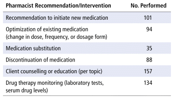 Data collected included participant demographic characteristics, medication regimen before pharmacist intervention, number and category of DTPs identified by the pharmacist, the pharmacist’s recommendations after assessment, and the rate of implementation of those recommendations by the client’s prescriber(s) within 6 months after the assessment.