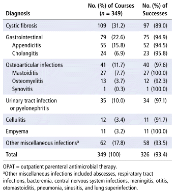 8 Madigan T, Banerjee R. Characteristics and outcomes of outpatient parenteral antimicrobial therapy at an academic children’s hospital. Pediatr Infect Dis J. 2013;32(4):346–9.