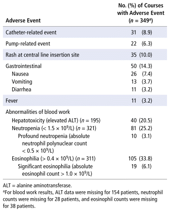 Au total, 349 traitements (administrés à 262 patients) ont été inclus dans l’étude. Ils ont été efficaces et bien tolérés chez la plupart des patients, avec un succès global de 93,4 % (326/349). Peu de symptômes gastro-intestinaux et d’éruptions cutanées ont été rapportés. La neutropénie et l’éosinophilie ont été observées plus fréquemment que dans les études précédentes. Les effets indésirables liés à l’ABAD concernaient principalement des problèmes liés au cathéter (8,9 %, 31/349) et à l’utilisation de la pompe (6,3 %, 22/349).