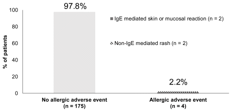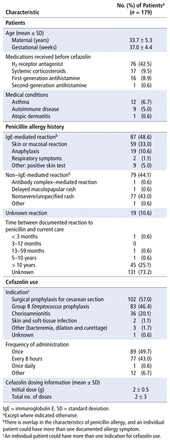 A total of 179 patients were included in the analysis. Most (175 [97.8%]) had no allergic adverse event after receiving cefazolin. Two patients (1.1%) experienced immunoglobulin E (IgE)–mediated hives, and 2 patients (1.1%) experienced non–IgE-mediated rashes. No patients experienced anaphylaxis, and no patients with a documented history of anaphylaxis to penicillins experienced an allergic adverse event related to cefazolin. All 4 patients who experienced an allergic adverse event were discharged with no readmission to the study institution associated with the allergic adverse event.