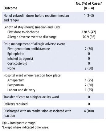 This study also described nonallergic ADEs and their association with cefazolin. In particular, we found that 44.7% of patients may have had nonallergic ADEs related to cefazolin. Previous retrospective studies examining cefazolin exposure in penicillin-allergic pregnant patients did not report nonallergic ADEs or their association with cefazolin exposure.13,14 For all events reported in our study, the associated Naranjo score was 3 or below, indicating a possible association between the event and exposure to cefazolin. A possible association is present when the reaction follows a temporal sequence after administration of a drug and may follow a recognized pattern for the suspected drug; however, there could be another equally likely explanation for the event and/or there is uncertainty or lack of information.20 We took a conservative approach and reported any adverse event; however, in doing so, we may have reported some adverse events with low probability of being associated with cefazolin. In general, cefazolin is a well-tolerated antibiotic with minimal adverse effects.26 The high proportion of nonallergic ADEs reported in our study could also be secondary to the patients’ labour and delivery. Nausea and/or vomiting, dizziness, abdominal pain, headache, and diarrhea are commonly reported events that may be associated with labour and delivery, postpartum complications, and other concomitant medications given antepartum.27,28