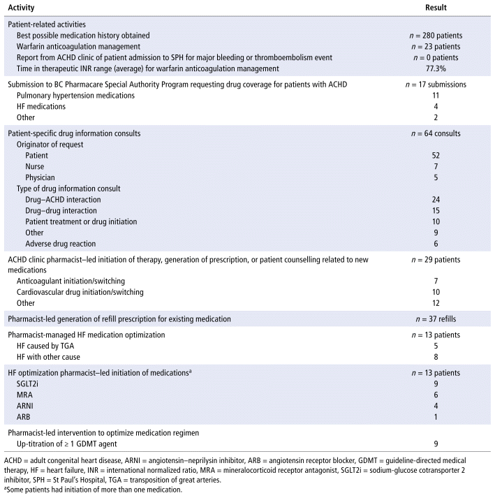 TABLE 1 Clinical Pharmacist Activities and Patient Outcomes in ACHD Program, St Paul’s Hospital, Vancouver, British Columbia
