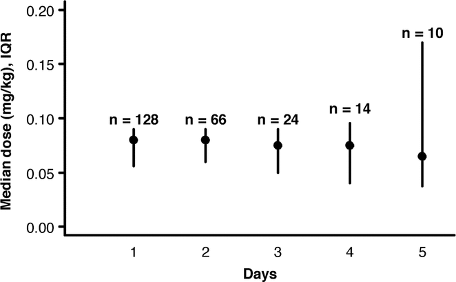 Among the patients who received more than one dose, the median dose on day 1 was 0.080 mg/kg. Over time, the median dose remained relatively stable, dipping slowly by day 5 to 0.065 mg/kg (Figure 1). The number of patients receiving morphine decreased from day 1 to day 5 (Table 1). Of the entire study sample (193 patients), 163 (84.5%) received up to 0.1 mg/kg per dose and 19 (9.8%) received more than 0.1 mg/kg per dose; for 11 patients (5.7%) body weight was not recorded and the weight-based dose could not be calculated.