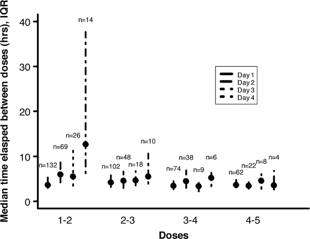 Figure 2. Time elapsed between pairs of doses over the first 4 postoperative days. Data are expressed as medians and interquartile ranges (IQRs). On the horizontal axis, “1–2” refers to the interval between the first and second doses, “2–3” refers to the interval between the second and third doses, and so on. The number of patients for each data point is indicated as the n value. If the time between 2 consecutive doses was more than 24 h, the second dose was registered on the next day. Data for time elapsed were not formally analyzed for postoperative days 5 through 7. By the fifth postoperative day, only 10 patients were still receiving morphine: 4 patients received a single dose on postoperative day 5, 2 patients received 3 doses, 3 patients received 6 doses, and 1 patient did not receive any morphine that day. By the sixth postoperative day, only 6 patients were still receiving morphine; these patients received 1 (3 patients), 3, 4, and 6 doses, respectively. By the seventh postoperative day, only 2 patients were receiving morphine (1 and 4 doses, respectively). |