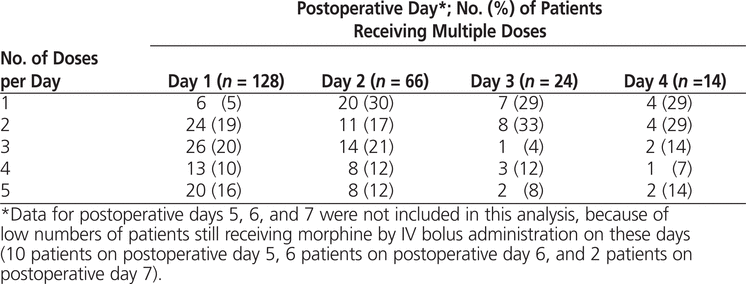 A total of 193 consecutive patient records were audited for this investigation. Fifty-three patients (27.5%) received a single dose of morphine, and the other 140 (72.5%) received more than 1 dose. Among these patients, the highest number of doses was noted on day 1. The number of doses decreased by day 2 and then remained relatively constant through day 5 (Table 1).