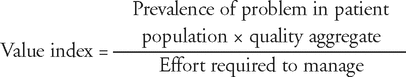 Once a candidate set of quality actions has been generated, each action can be evaluated according to its value index, and the set of actions prioritized accordingly. For example, an action involving a well-proven therapeutic intervention for a prevalent problem (e.g., statin therapy for patients with coronary artery disease) would have a high value index. However, if the target population was patients undergoing surgery and pharmacists had to rely on convincing reluctant surgeons to prescribe this type of therapy, the value index of this action would be considerably lower, because of the higher effort required to manage. On the other hand, if pharmacists had independent authority to initiate the therapy, the value index would increase substantially, because of a decrease in the denominator. Similarly, effort can be reduced by incorporating actions into protocols (e.g., risk assessment for preventing venous thromboembolism), which can free up time for pharmacists to have therapeutic discussions with patients and to spend more time on actions that are not easily incorporated into protocols.