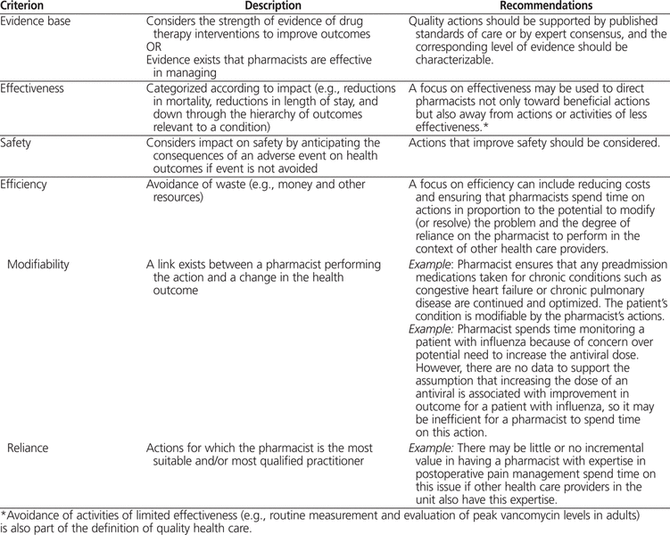 By anticipating the medical conditions that are prevalent in specific populations, it is possible to develop panels of quality actions. The process can be applied to the patient population in any discipline (e.g., medicine, critical care, pediatrics, oncology, surgery). The 4 main criteria for quality are evidence base, effectiveness, safety, and efficiency (Table 1). The aggregate of these criteria can be considered a “quality aggregate”. The criterion of efficiency has 2 subcriteria: modifiability and reliance on pharmacists to perform, which are important because pharmacists should align their efforts with what patients need them to do. “Modifiability” refers to processes or outcomes that pharmacists can reasonably be expected to alter. “Reliance on pharmacists to perform” refers to activities that the patient really needs the pharmacist to perform, as opposed to activities that could be done well by others on the team. Therefore, a total of 5 criteria form the quality aggregate. An action that meets all 5 criteria would have a higher value for conceptual quality aggregate than an action that meets only 3 of the criteria.