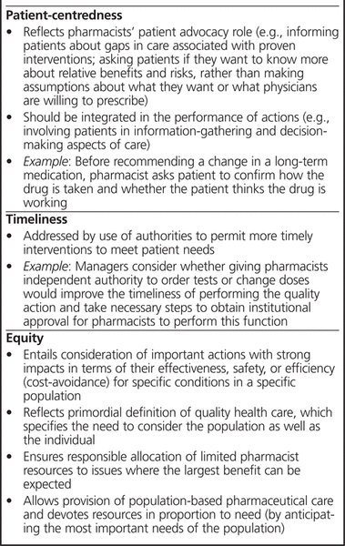 By integrating a panel of high-value quality actions into daily care, pharmacists would provide evidenced-based, safe, effective drug therapy that is efficient and equitable for patients’ needs.