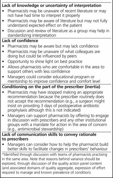 Finally, some pharmacists may feel that implementing the model would require precise quantification of the quality aggregate and the value index. However, such a scoring system is not a prerequisite for adopting the model. The quality actions and the value index form a conceptual framework that is actionable now by any pharmacist, in any practice area, to improve the care delivered. In its current form, this framework should help pharmacists to start thinking objectively in terms of quality actions and to start using the value index conceptually, to prioritize unanticipated issues and initiatives. Although they incorporate a formula, these concepts should not require precise mathematical expression to operationalize them in every situation. The framework should also allow most pharmacist teams to develop their own population-specific panels of quality actions. Thoughtful discussion of the reasons for disagreement about the quality aggregate or the effort required to manage will be needed to reveal opportunities for improvement (Box 2). This is a critical step in the process, which cannot be replaced by a scoring system. Nonetheless, a scoring system could improve the transparency of the ranking and decision-making process for selecting quality actions, as it would ensure that the domains of the quality aggregate and the components of the value index have been properly considered. It would more readily reveal where disagreement lies. We believe that a scoring system, based on levels of evidence, efficacy, and safety (as shown in Table 1), could be developed for the quality aggregate and other model components to produce the value index. We hope that introducing these concepts here will foster dialogue to inform such research.