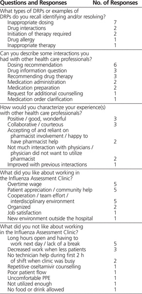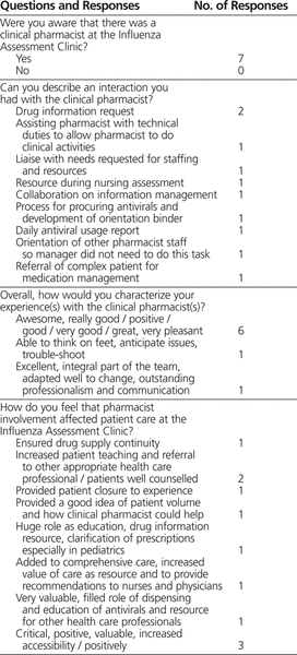 A short satisfaction survey was conducted in July 2010 with a small number of pharmacists and other health care professionals who had worked at the clinic (Tables 1 and 2). Each of the 8 pharmacists surveyed had worked between 1 and 6 shifts while the Influenza Assessment Clinic was open.